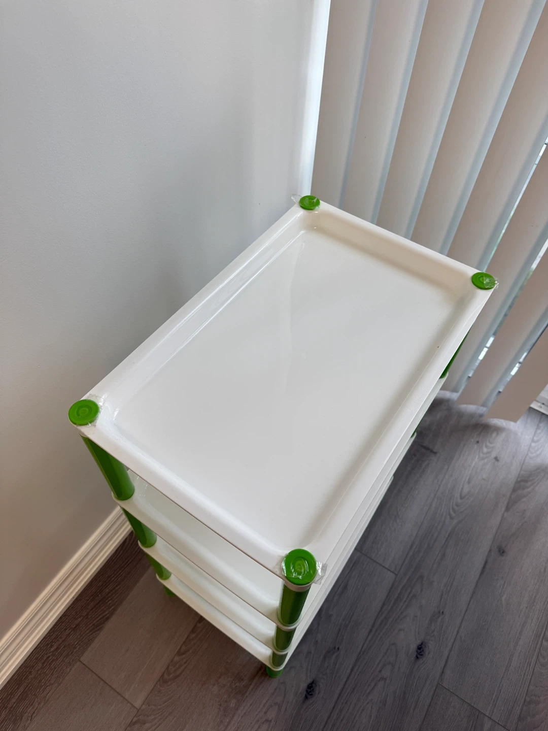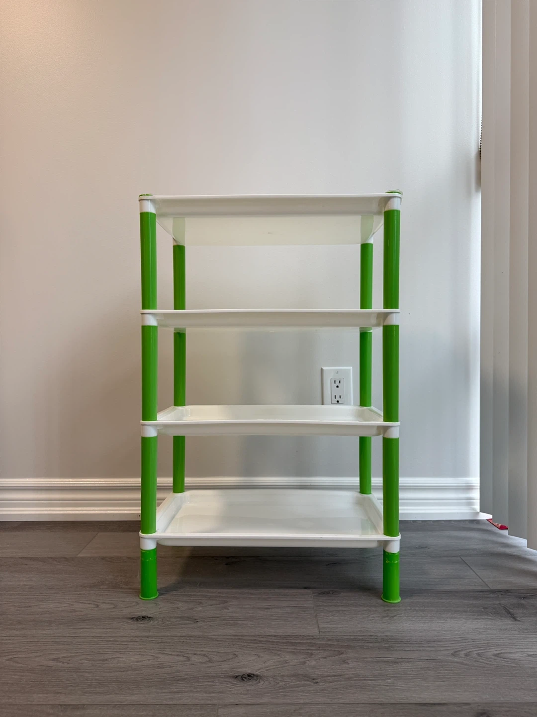 Here's a handy 4-tier shelf (45.5*29*70 cm)perfect for organizing your space! It's made of durable plastic, with white shelves and green supports. Great for a closet, bathroom, or anywhere you need a little extra storage