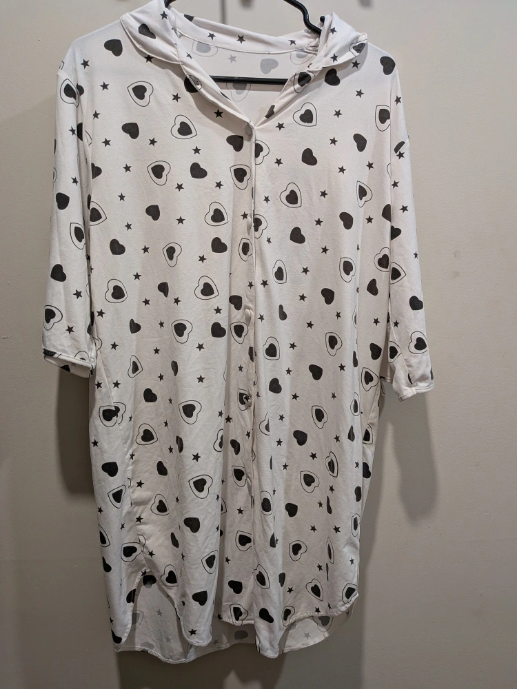 Cute and comfy white dress with an all-over print of hearts and stars! button-up front, perfect for lounging or casual wear