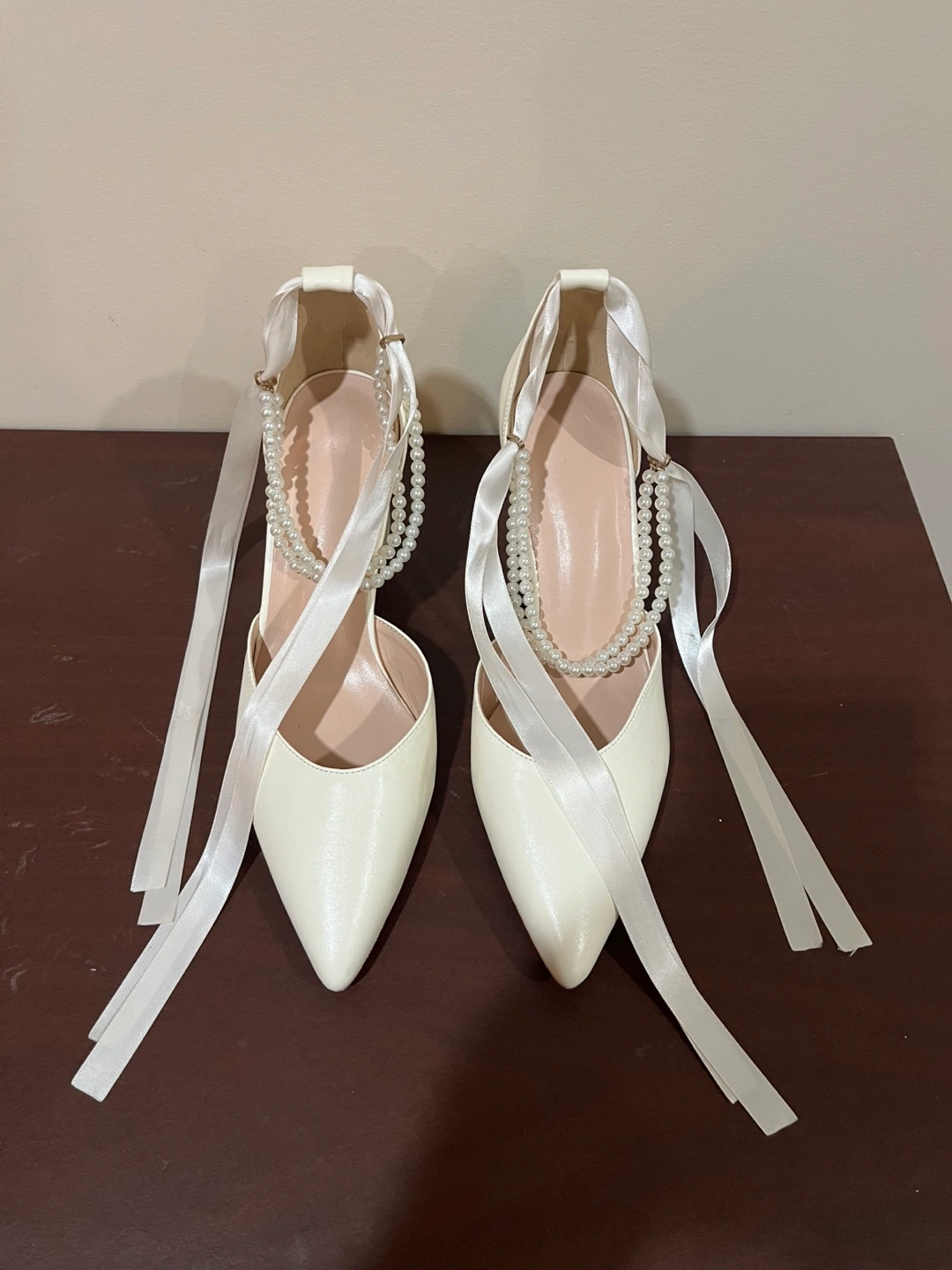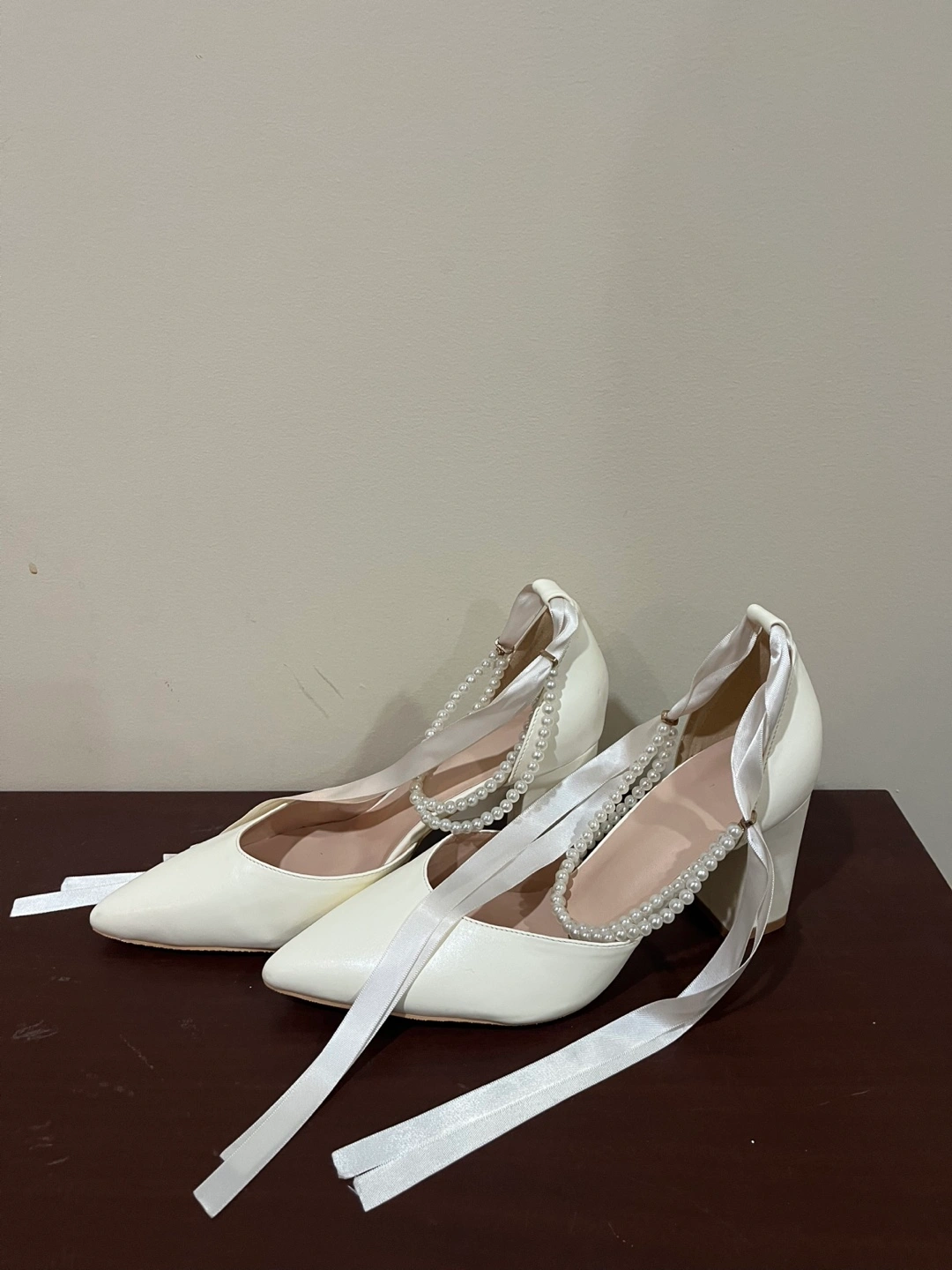These are a pair of lovely white heels, perfect for a special occasion! They feature a delicate pearl detail that adds a touch of elegance. They're a size 7 and in great condition, ready for a new home