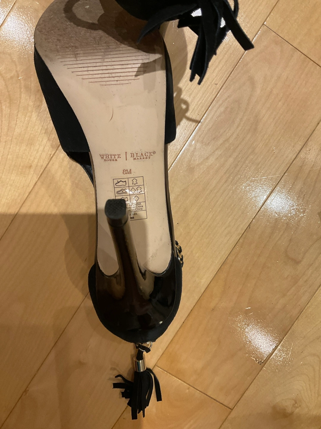 Selling a pair of White House Black Market high heels in size 8M. They come with the original box and a dust bag. These stylish black suede heels feature a delicate gold chain detail around the ankle strap and a tassel on the back zipper. Perfect for a night out! They are in great condition.