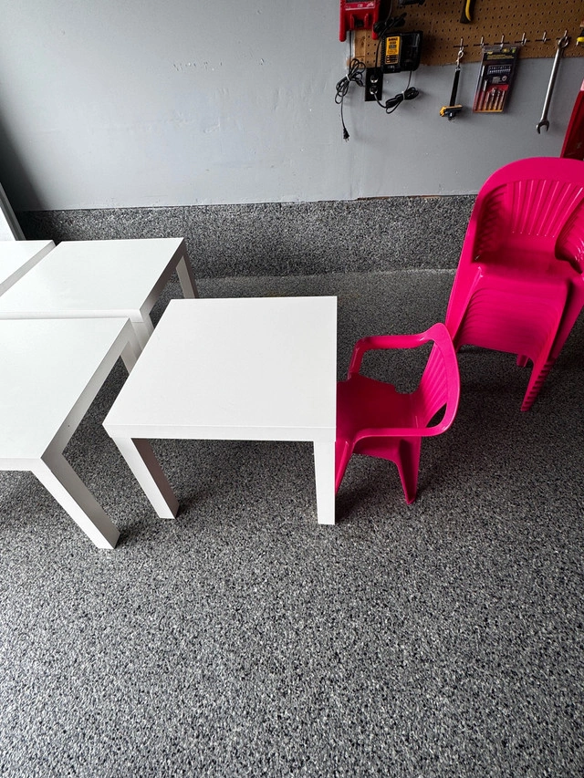 I have for sale 5 IKEA Lack side tables, perfect for adding a clean, minimalist touch to any room! These compact tables are super versatile; use them as nightstands, coffee tables, or even creative shelving units. The table's dimensions are 55x55 cm. * Brand: IKEA * Model: Lack * Colour: White * Dimensions: 55 cm x 55 cm * Condition: Like new. Bought them for a kids birthday party. 5 individual tables available for $10 each. I also have 12 kids patio style chairs in pink that are the perfect height at $3 each. If you're reading this, the tables are still available. Pick up in Woodbridge.