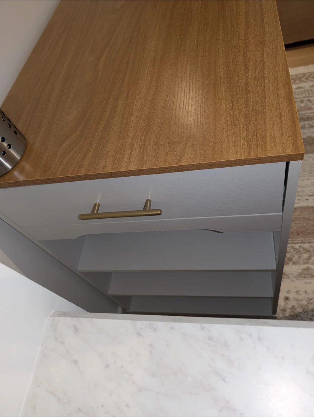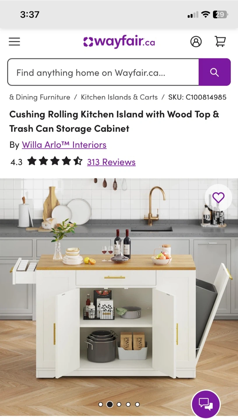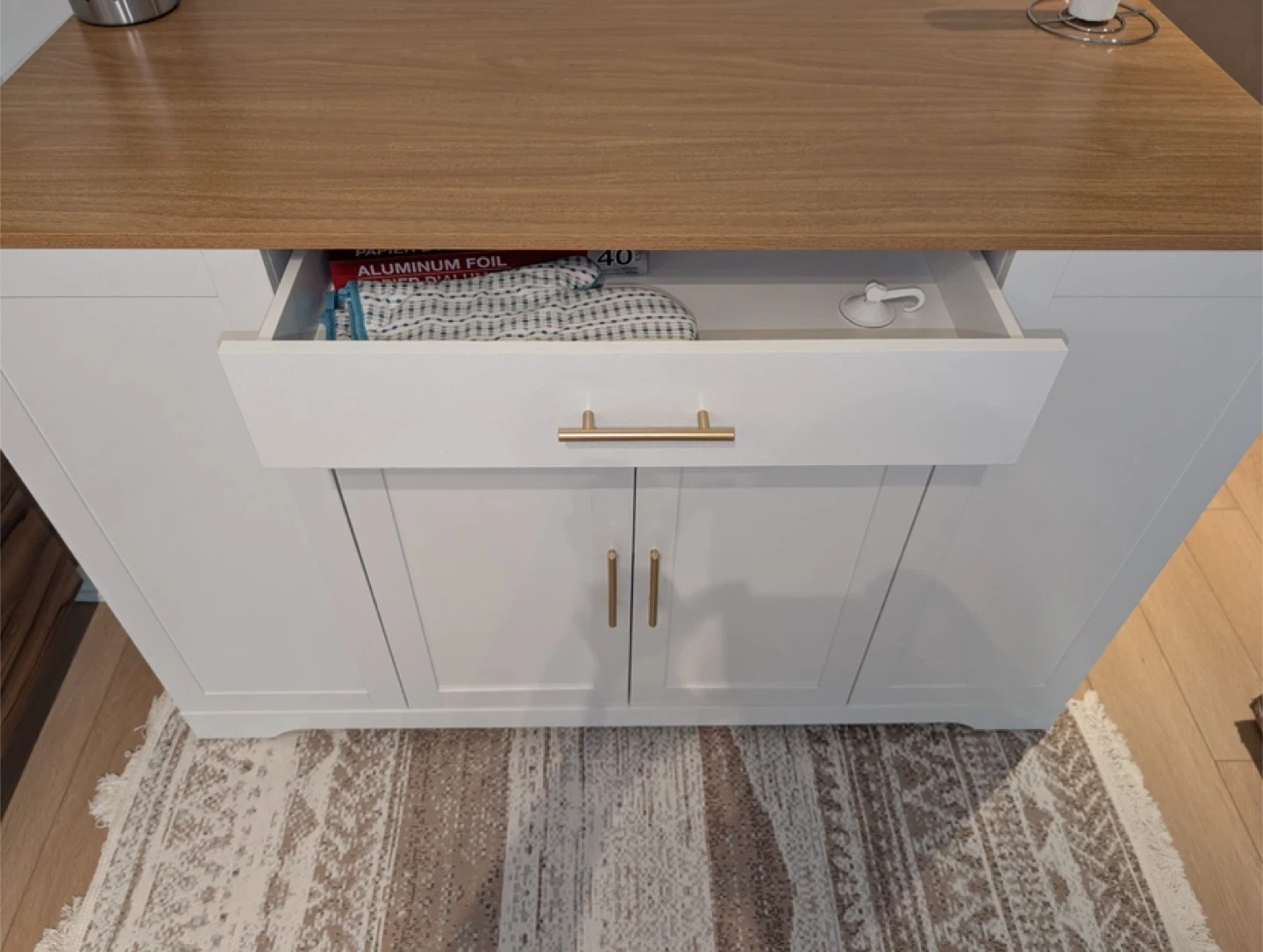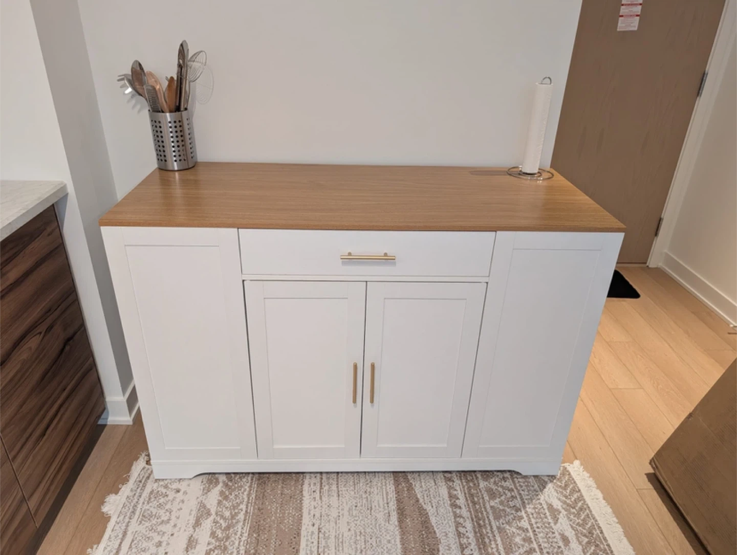 Selling a kitchen island with a white base and a wooden top. It features drawers and cabinet space for storage. It's in great condition and would be a lovely addition to any kitchen! Completely brand new-still in its original box. Unopened.