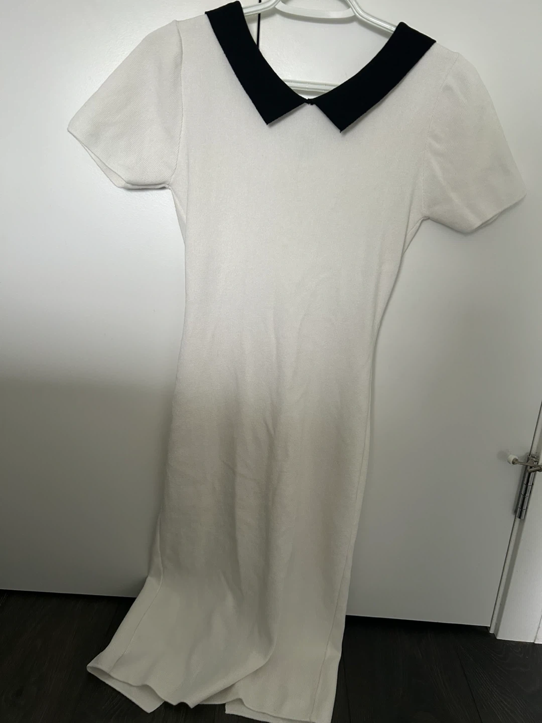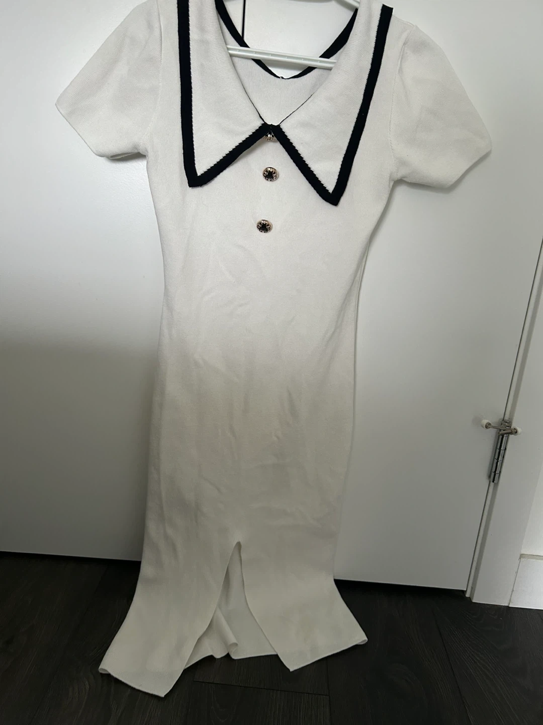 A lovely white knit dress featuring a stylish black collar. It has short sleeves and button details, perfect for a chic and comfortable look. The dress is in great condition and ready for a new home