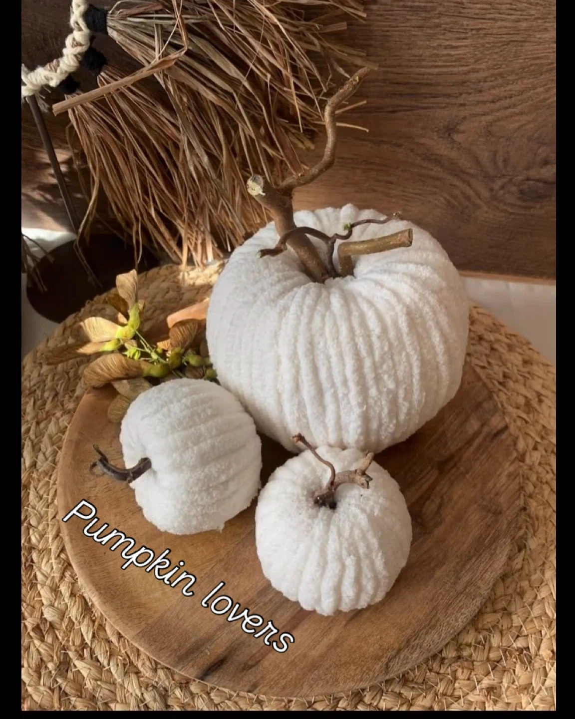 HAND MADE BY ME !! Costume made These adorable white knitted pumpkins are perfect for adding a touch of cozy autumn charm to your home! They come in a set of three different sizes, great for decorating your table or shelves. They're in great condition and ready to bring some fall vibes to your space