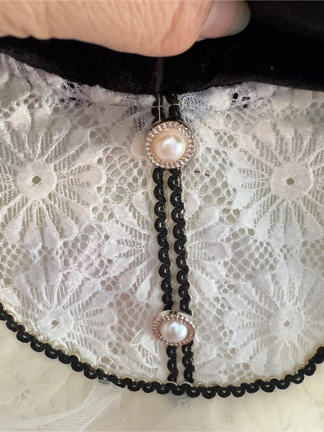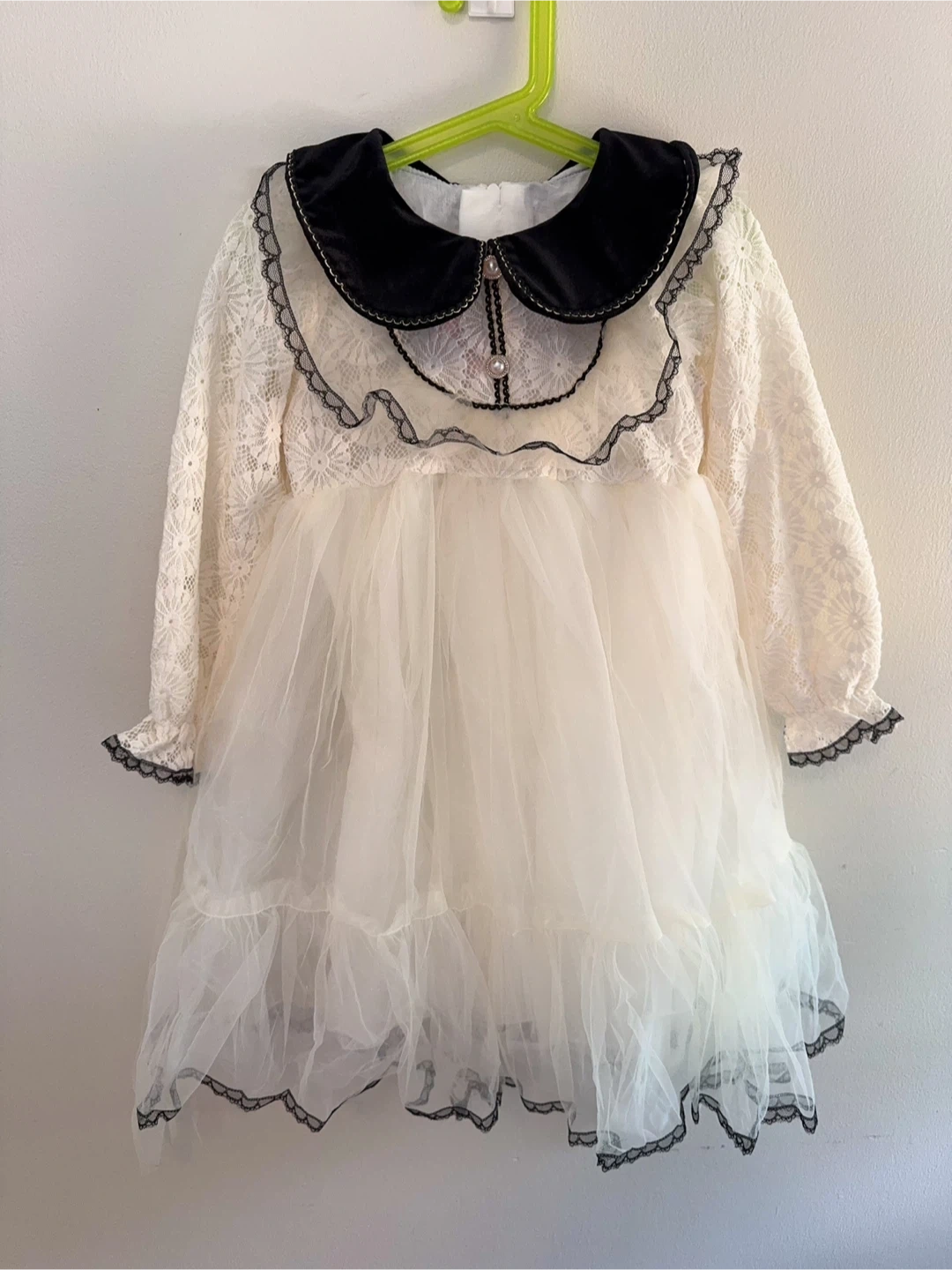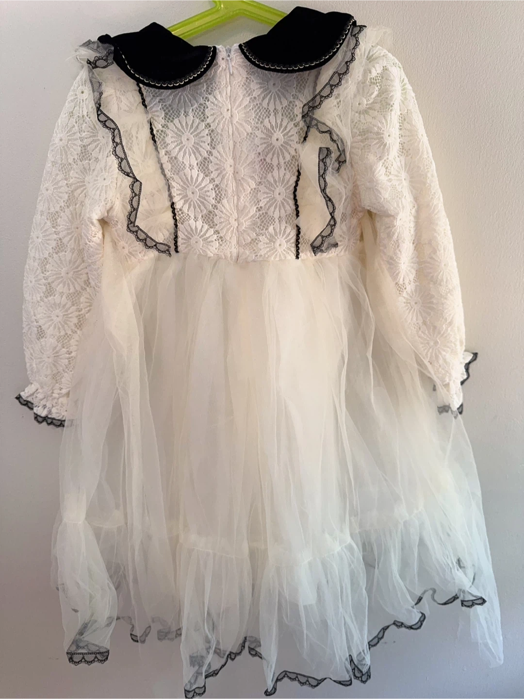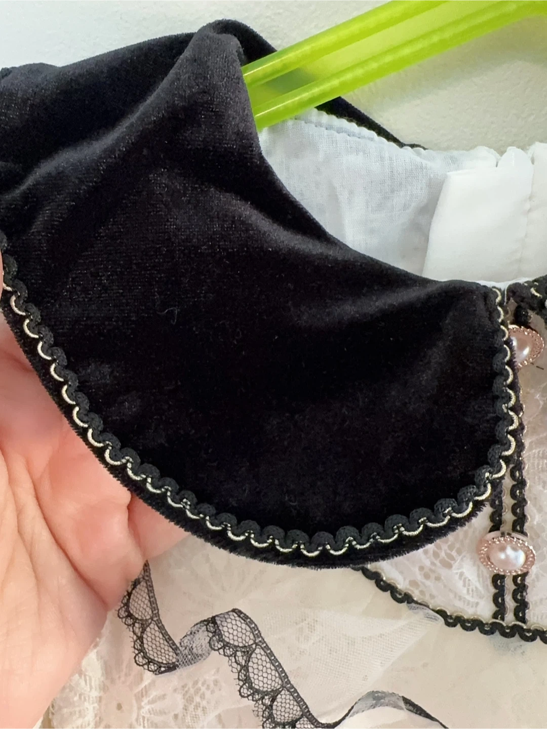 Selling a cute white dress with lace detailing and a black velvet collar. It has pearl-like buttons and a layered tulle skirt. Perfect for a special occasion or just feeling fancy!
