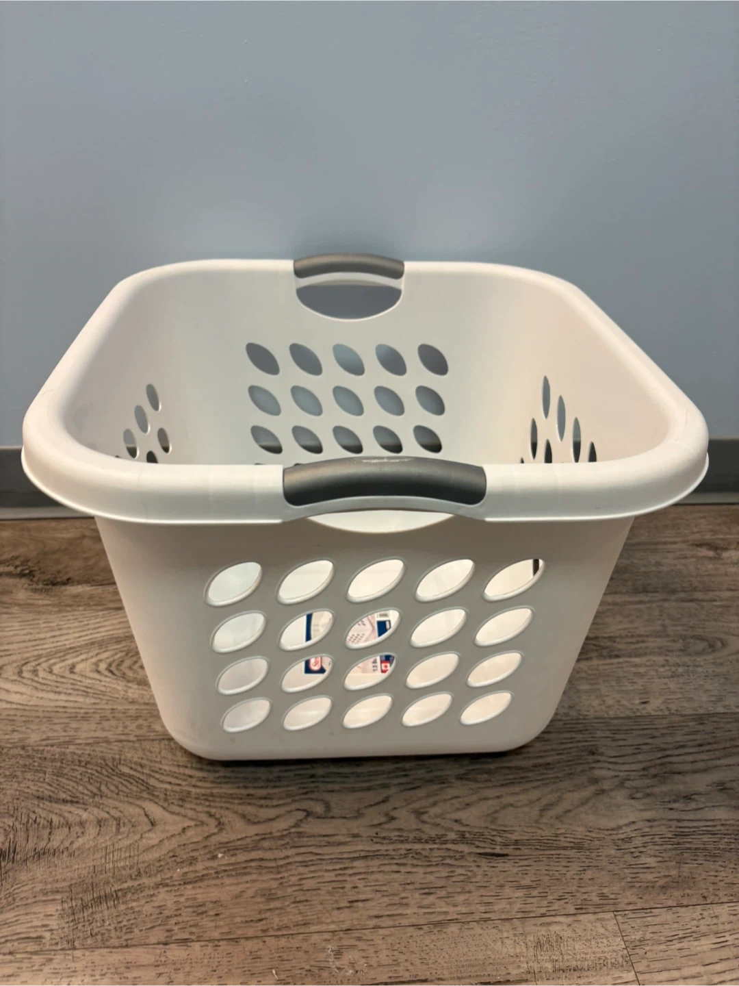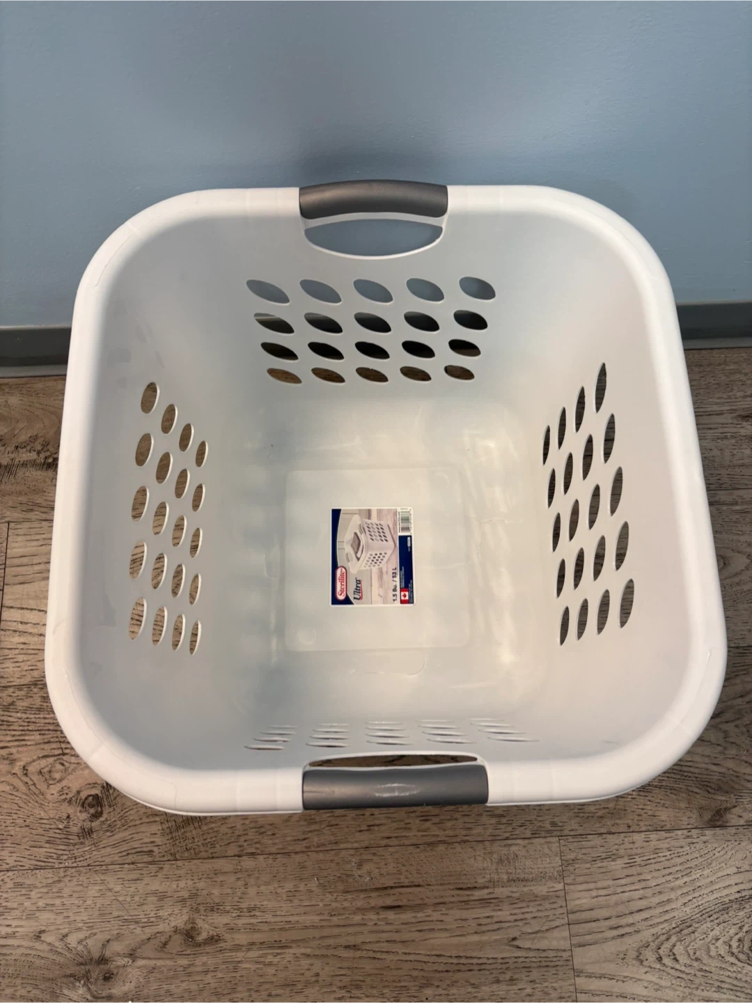Laundry basket in great condition! It's a nice size and has handles for easy carrying. Small crack in the bottom, but still very useable barely noticeable.