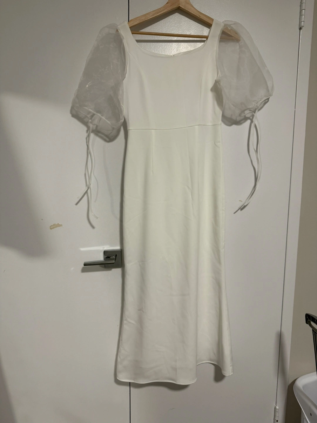 Selling a beautiful white dress that would be perfect for a photo shoot or an outdoor wedding! It has unique organza sleeves. The dress is in great condition and worn only once.
