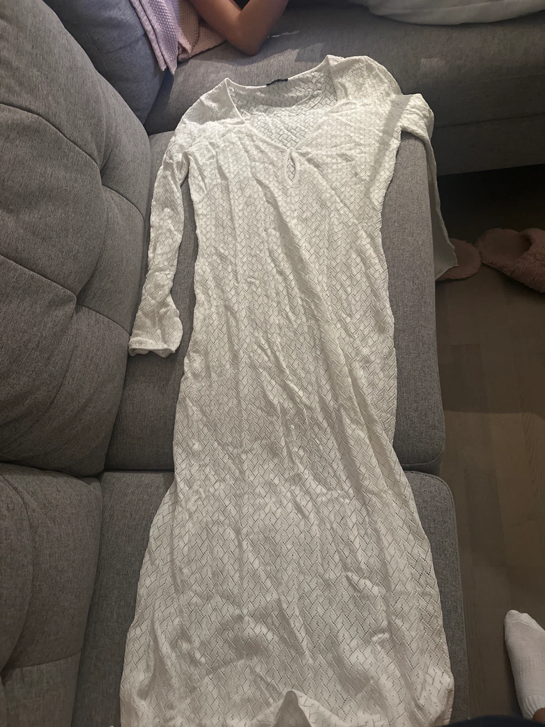 A lovely white long sleeve dress, perfect for a casual outing or a beach cover-up! It has a unique woven pattern that adds a touch of elegance. It's in great condition and ready for a new home. Never been worn before.