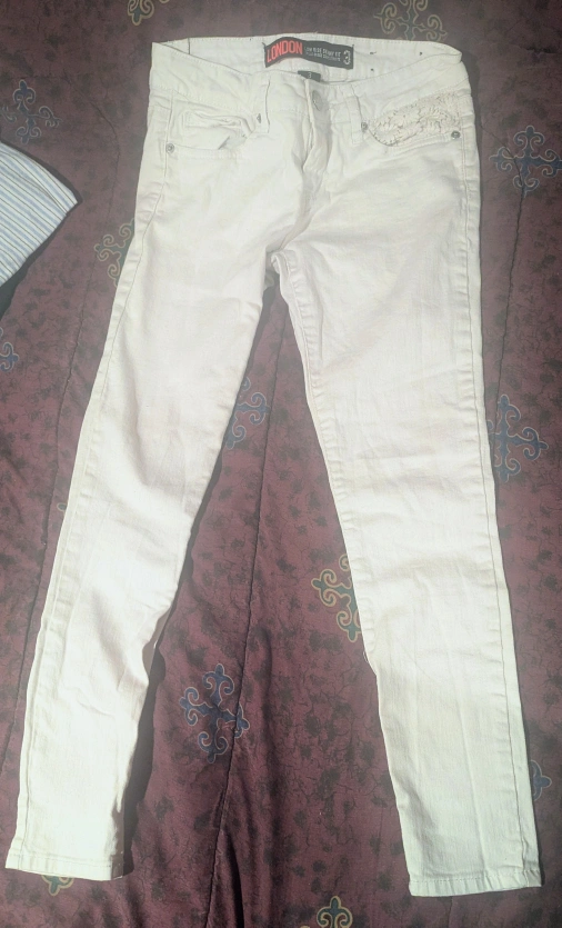 Selling a pair of white London low rise skinny fit jeans. They are size 3 and feature a cute flower lace detail on the front and back pockets. Perfect for a casual day out! ๐ค