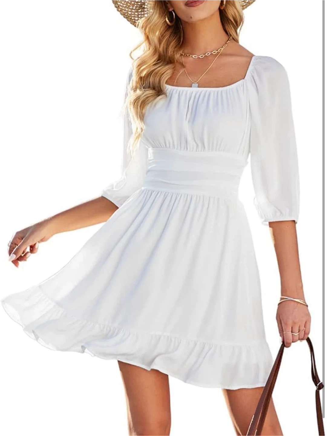 Selling a cute white mini dress! It features a square neckline, 3/4 sleeves, and a smocked waist. The back has a tie detail, adding a touch of elegance. Perfect for summer days or casual outings