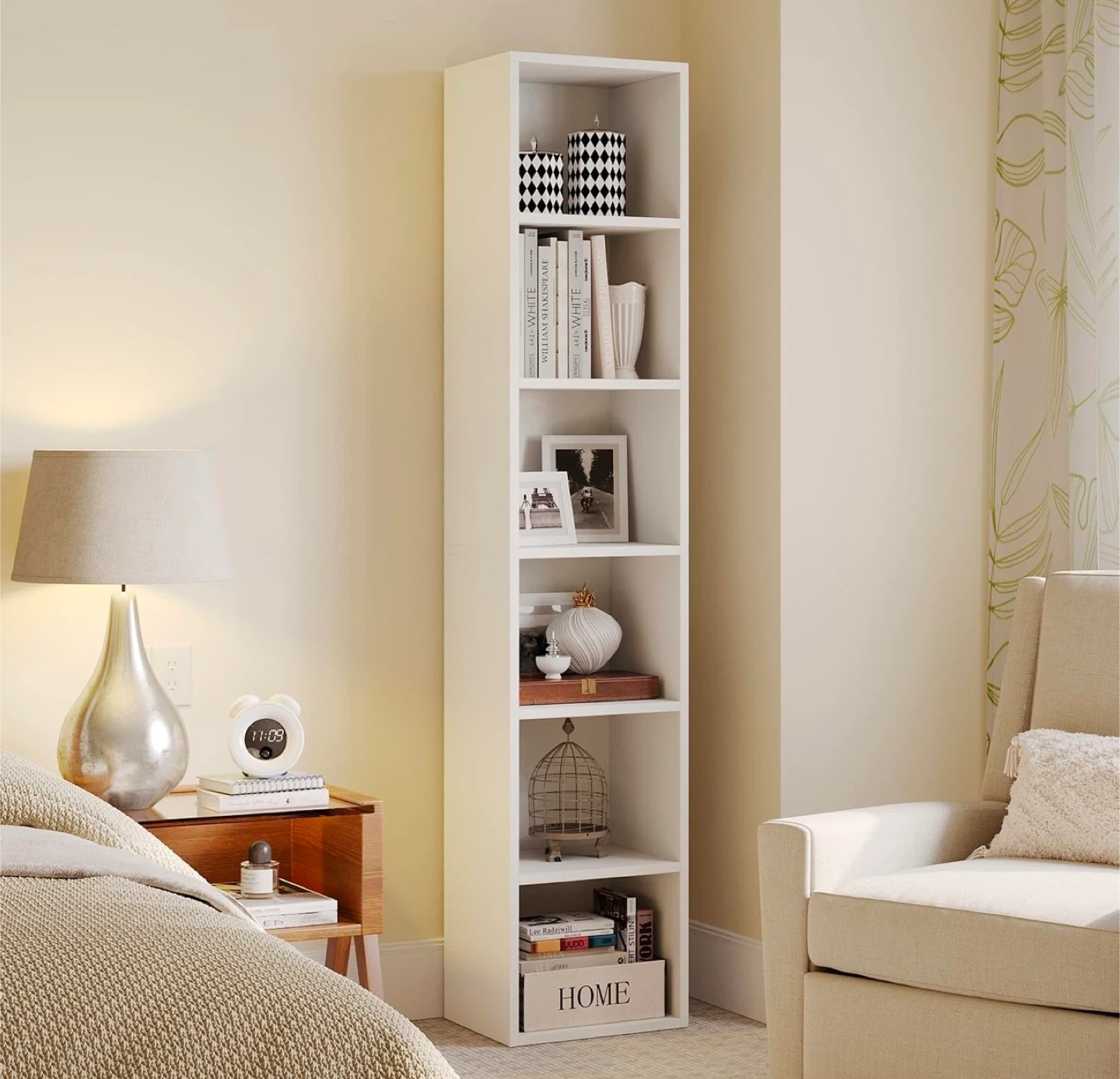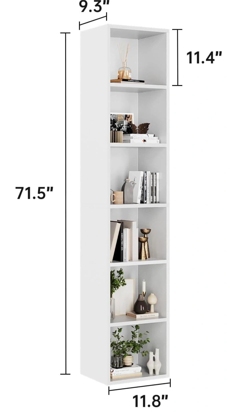This white narrow bookshelf is perfect for maximizing your space potential! It's easy to clean and made with a high-quality thick board. It offers ample storage space with its 6-tier design. The dimensions are approximately 71.5" in height, 11.8" in width, and 9.3" in depth.