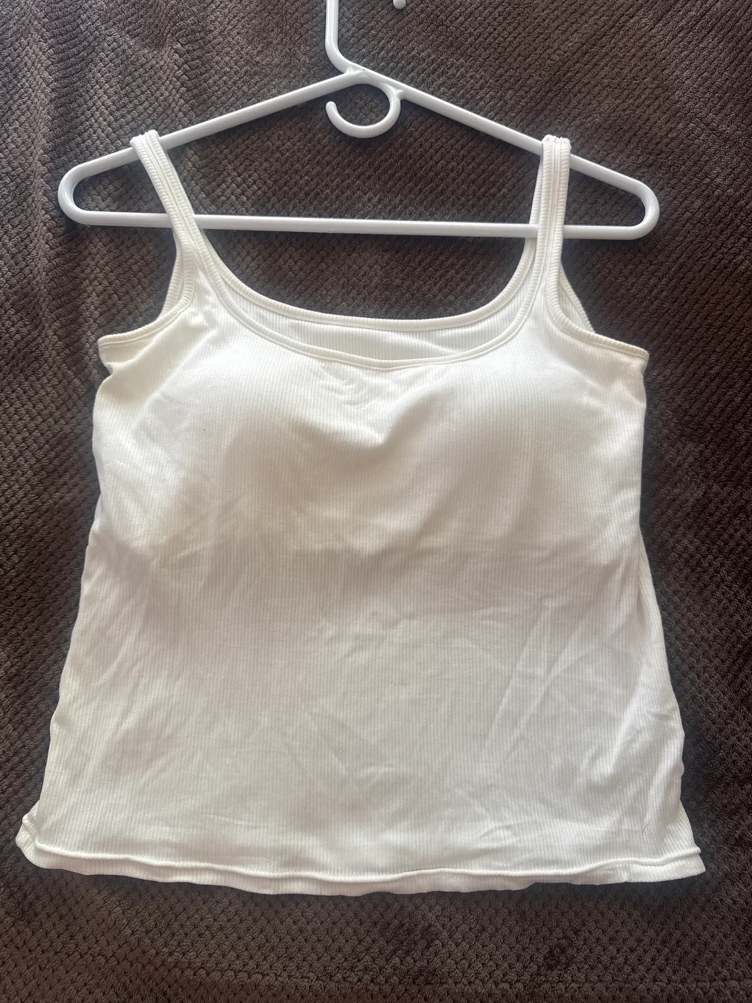 Selling a comfy white tank top! The size is L and it's made of 92% Viscose and 8% Elastane. It's in great condition and ready for a new home
