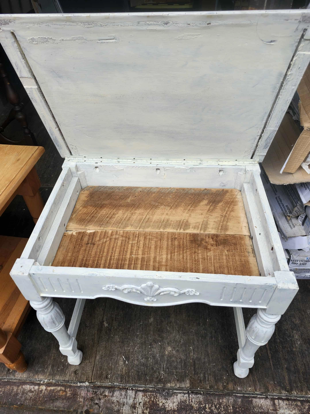 Selling a charming white painted side table. It features a lift-top design, perfect for extra storage. The ornate details add a touch of elegance to any room. It's in good condition and ready for a new home! Cash only