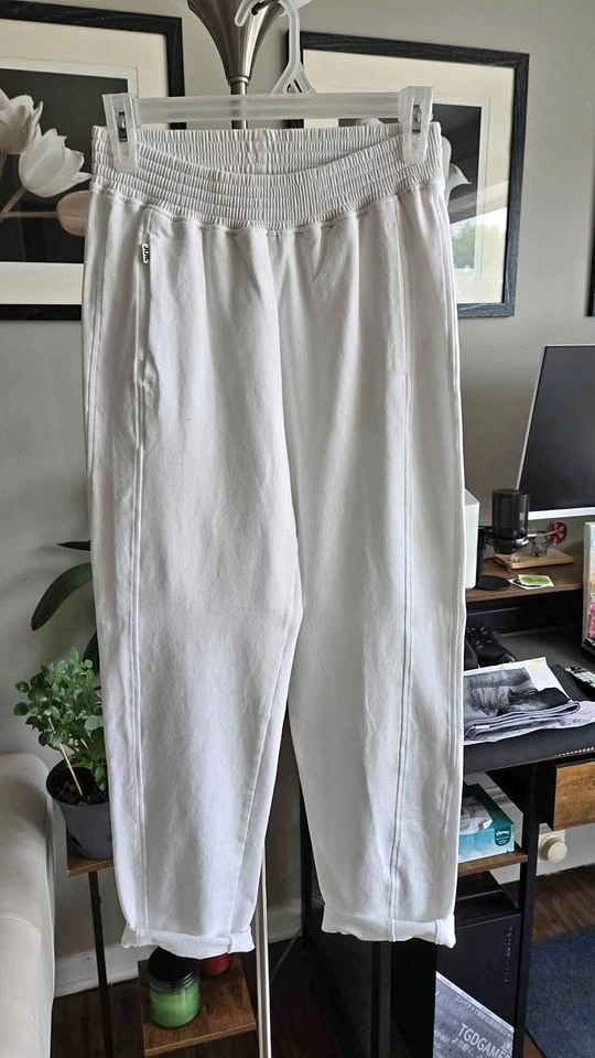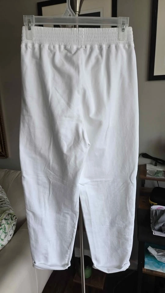 Beautiful white sports pants, thin, with elastic waistband and pockets, raw edges at the bottom. Very stylish and light for summer and warm autumn. Size S-M