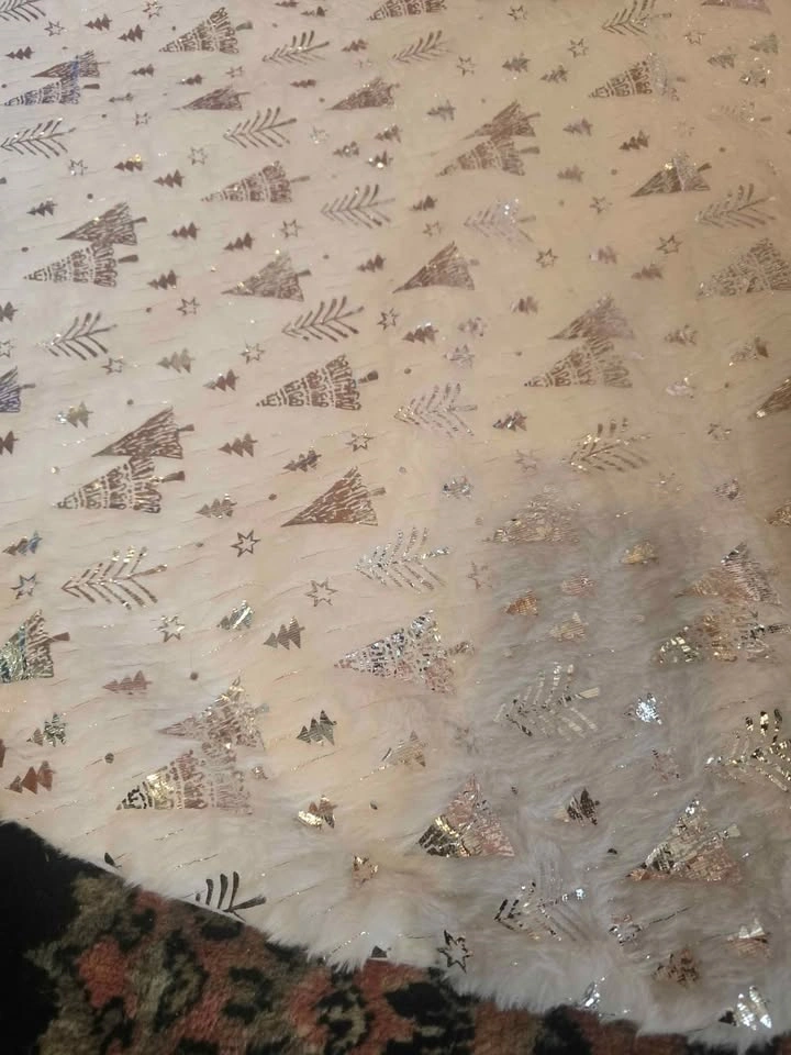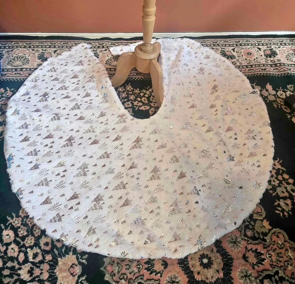 Gorgeous soft tree skirt with shimmering silver tree and star pattern โ adds a cozy and elegant touch to your holiday dรฉcor. Perfect for wrapping around the base of your Christmas tree to hide the stand and give it a festive, finished look. Color: White with silver glitter design Diameter: ~120 cm (approx. 47 inches) Material: Faux fur with sequin overlay Condition: Brand New Price: $10 (Retail $35+) Pickup in Mission near Centennial Park.