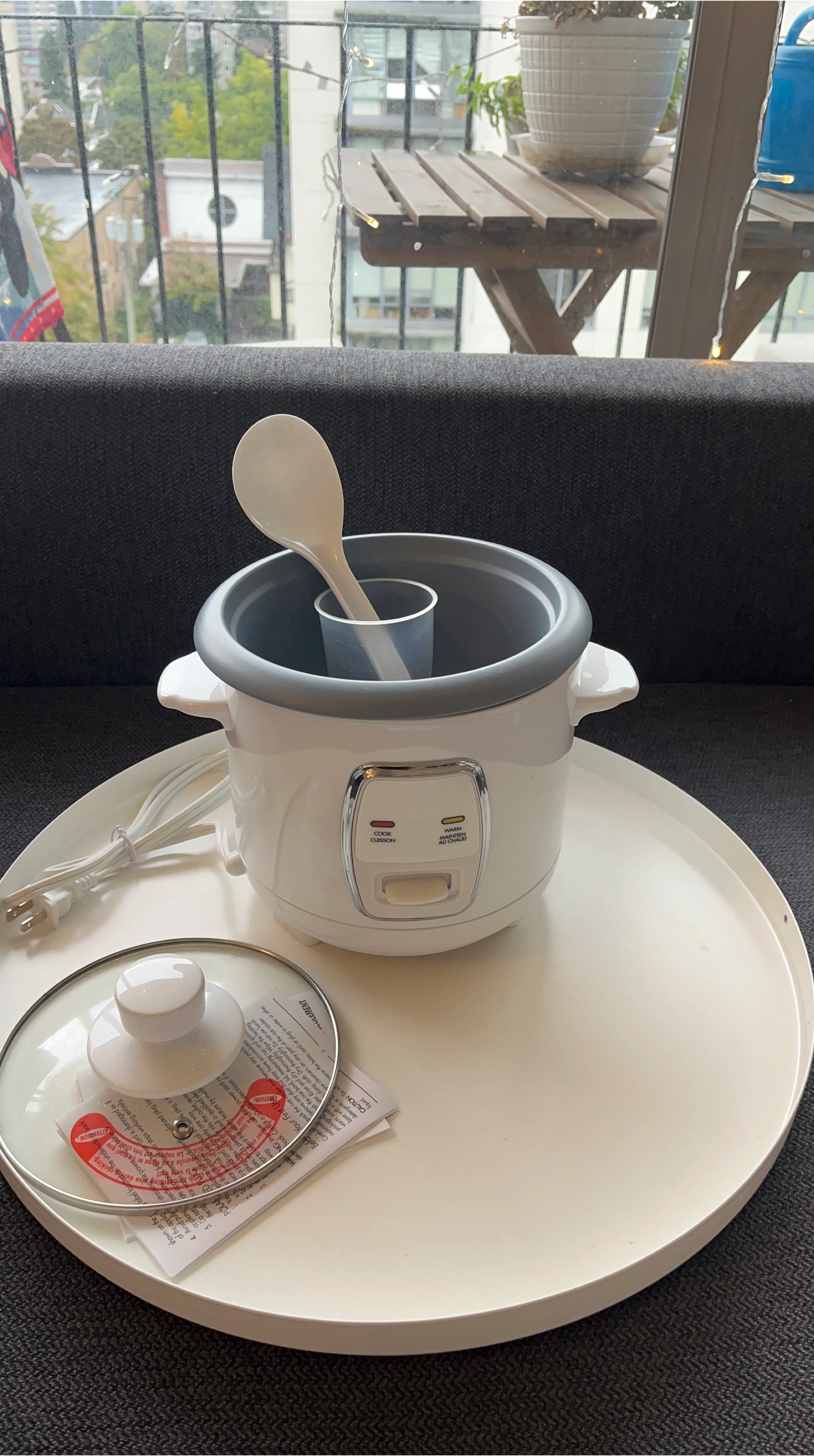 Selling a compact white rice cooker that's perfect for small kitchens or single servings! It comes with a glass lid, a rice spatula, and a measuring cup so you have everything you need to cook rice perfectly every time