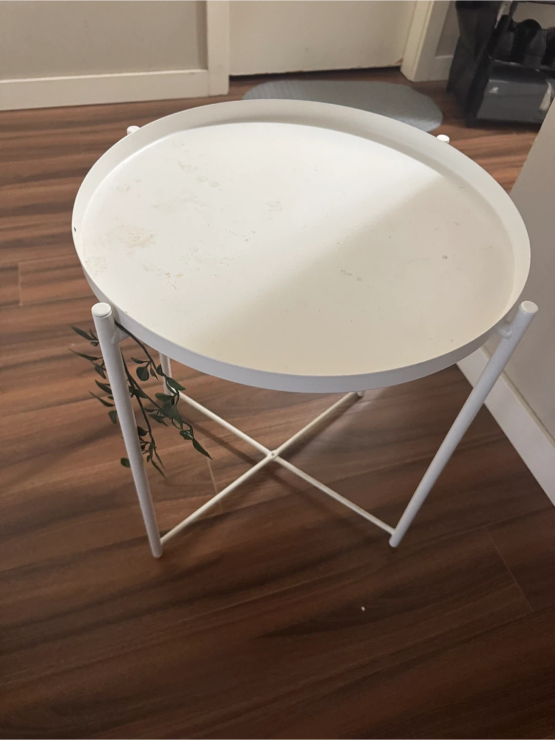 Selling a simple white round side table! It's perfect for small spaces or as an accent piece. It has a clean, minimalist design that would fit well in any room. It's in good condition and ready for a new home!