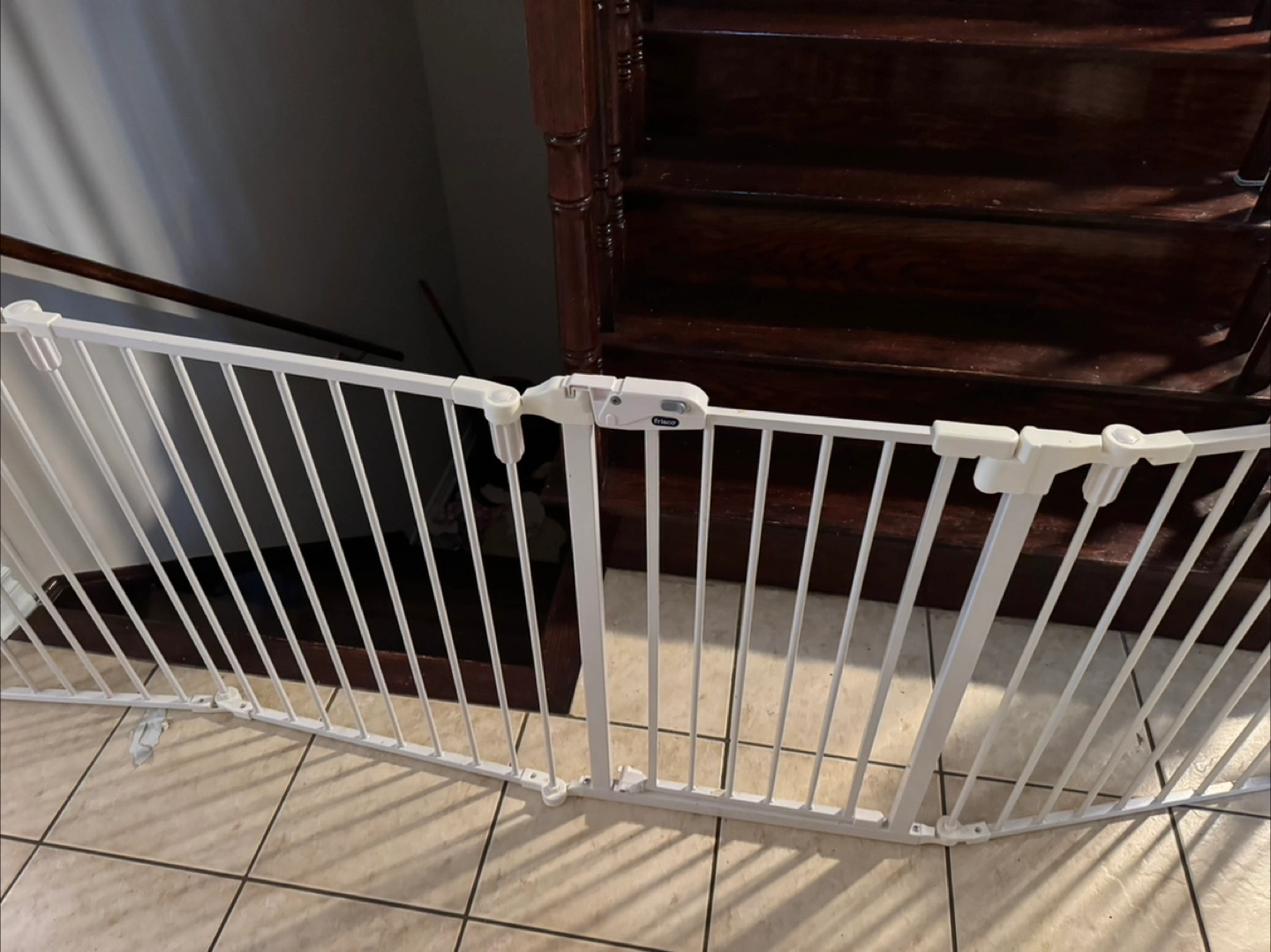 Safety gate, white in colour. Made of metal bars. Suitable for a doorway or stairs, for child or pet safety. Using this gate will surely give you peace of mind.. We are moving from canada want to sell all the furniture.