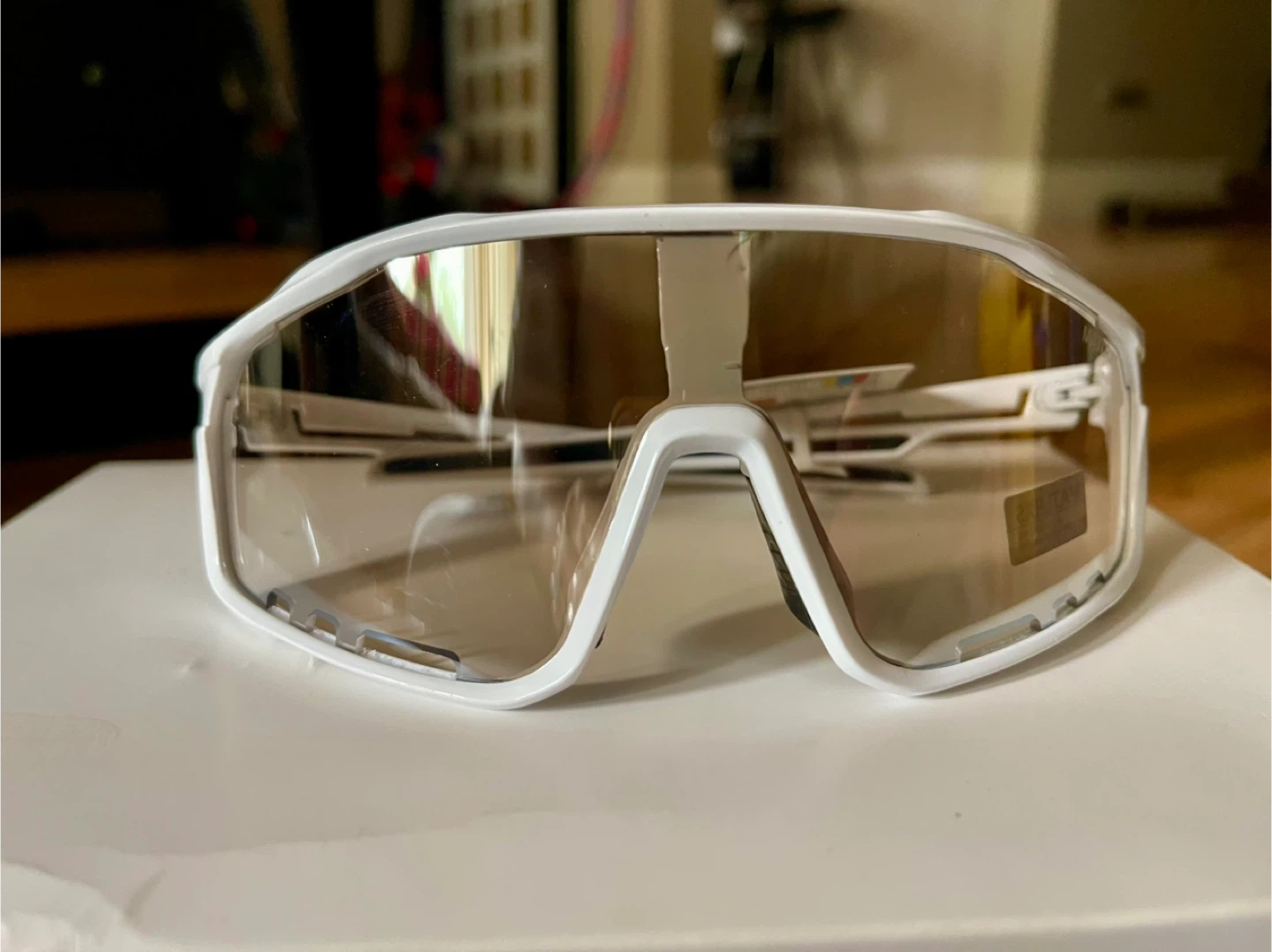 Selling a pair of sports sunglasses in white. They're in great condition and ready for sunny days! Brand new