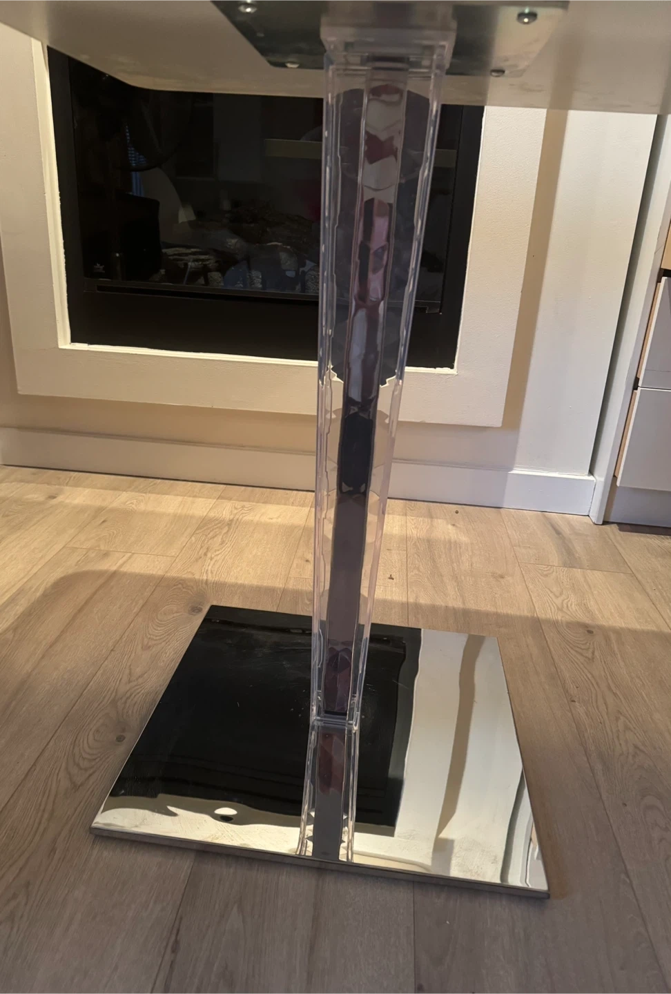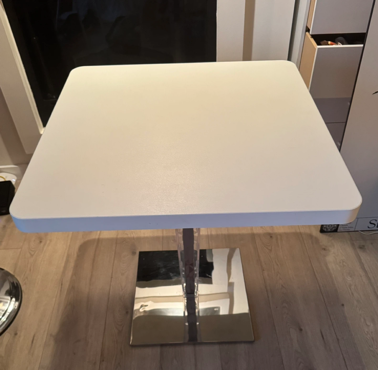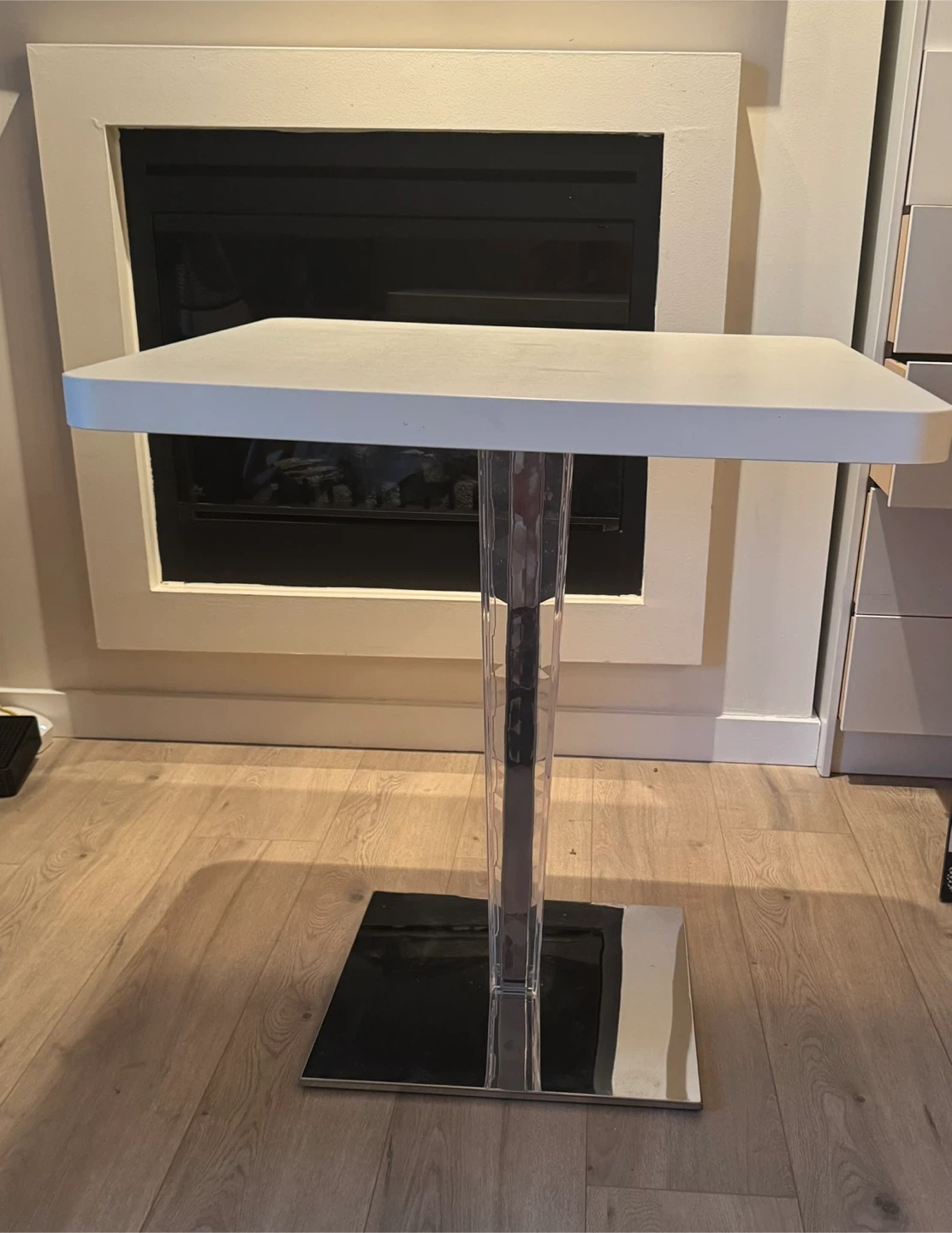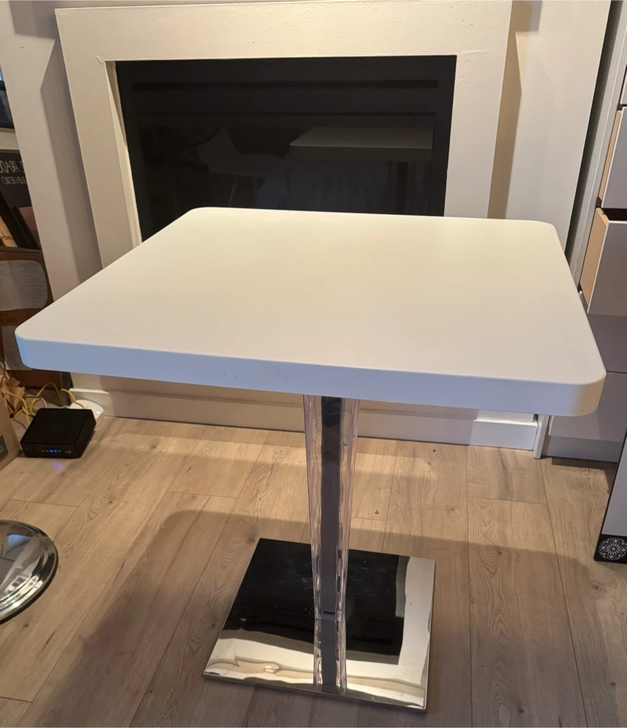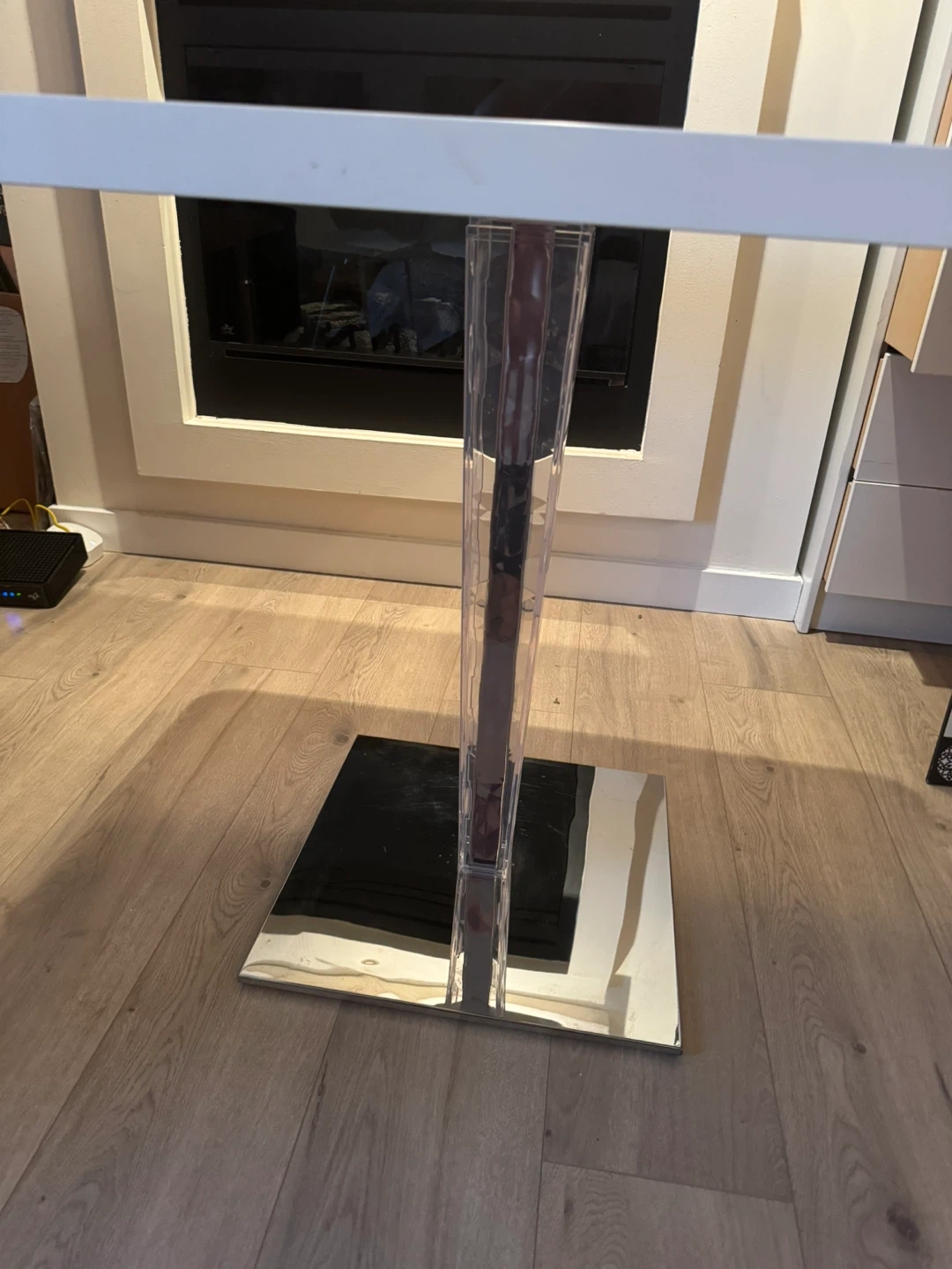 Selling a stylish white square dining table. It features a clear acrylic pedestal and a heavy mirrored base. This table would be a great addition to any modern home, especially a studio apt