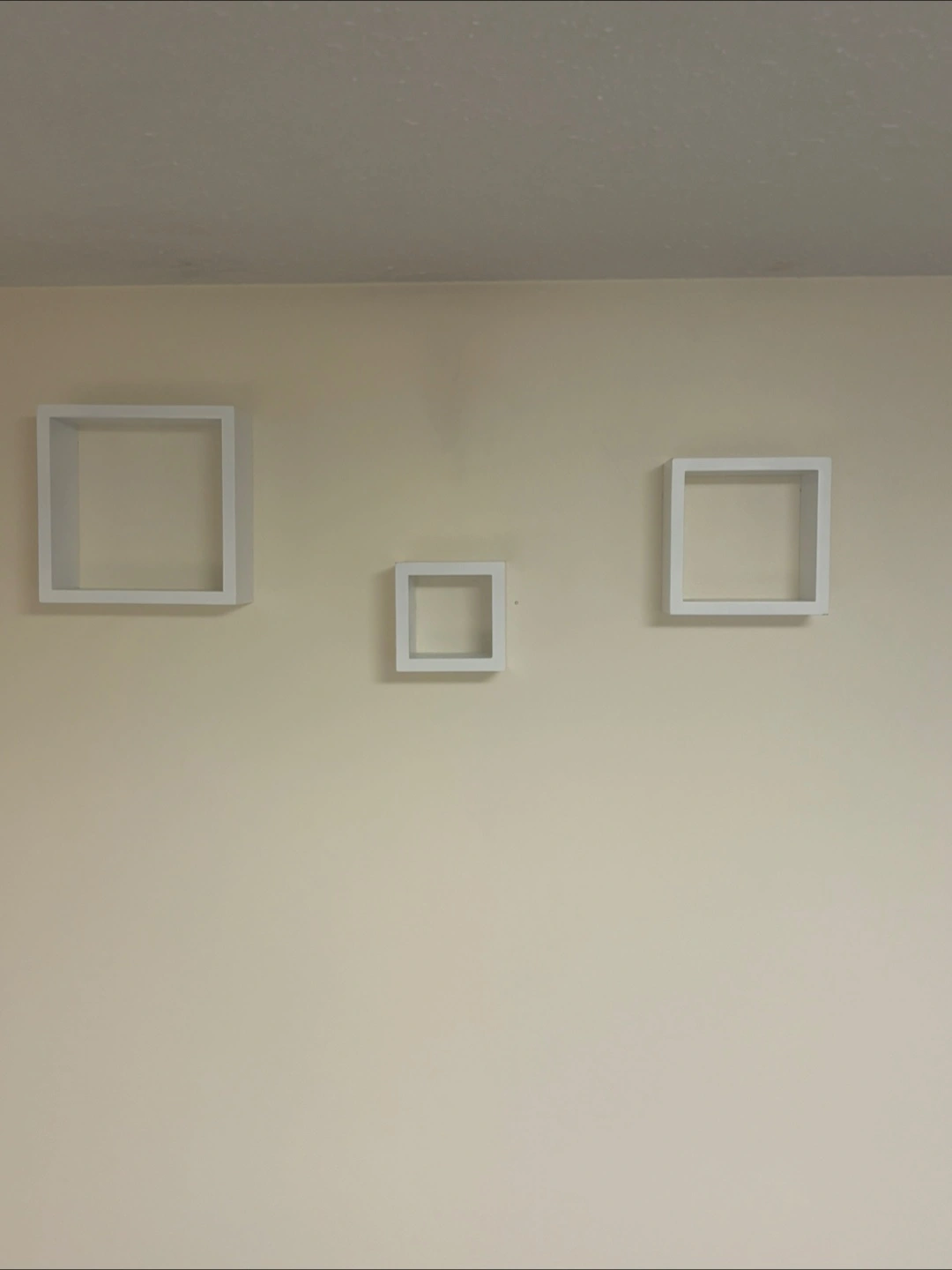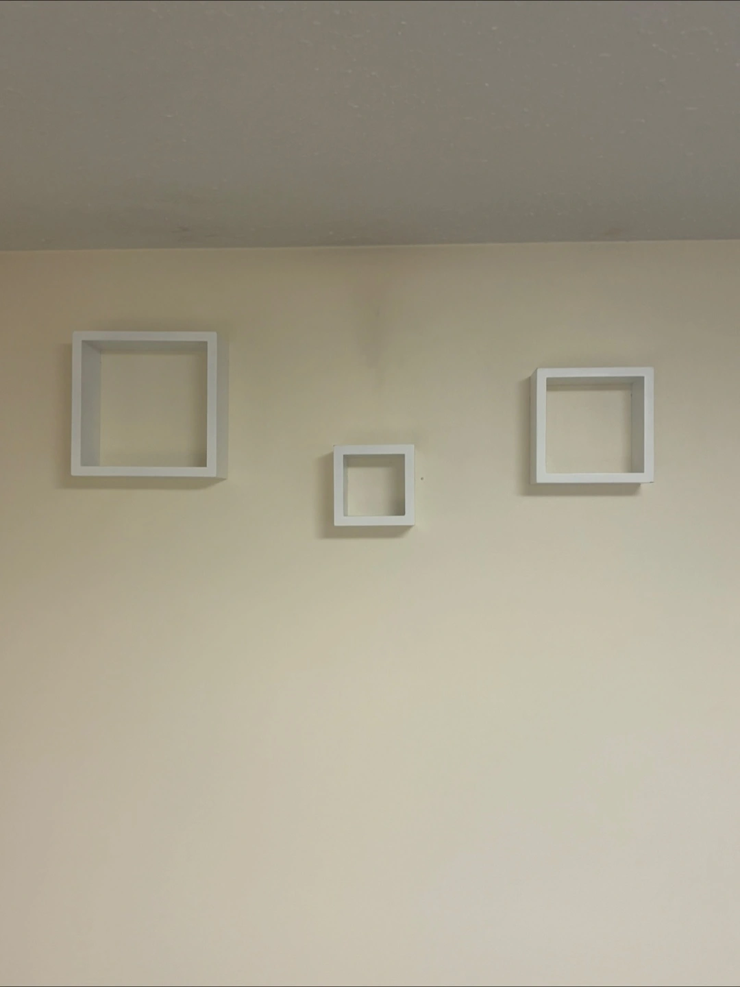 Selling a set of three square wall shelves. They're white and come in various sizes, perfect for adding a modern touch to any room. They are in great condition and easy to install!