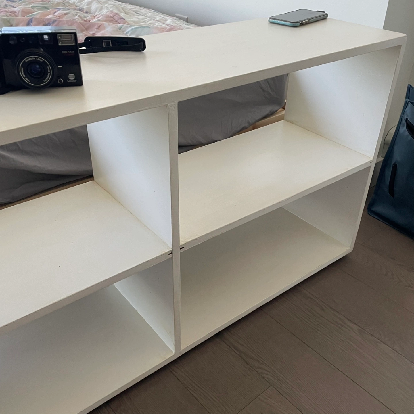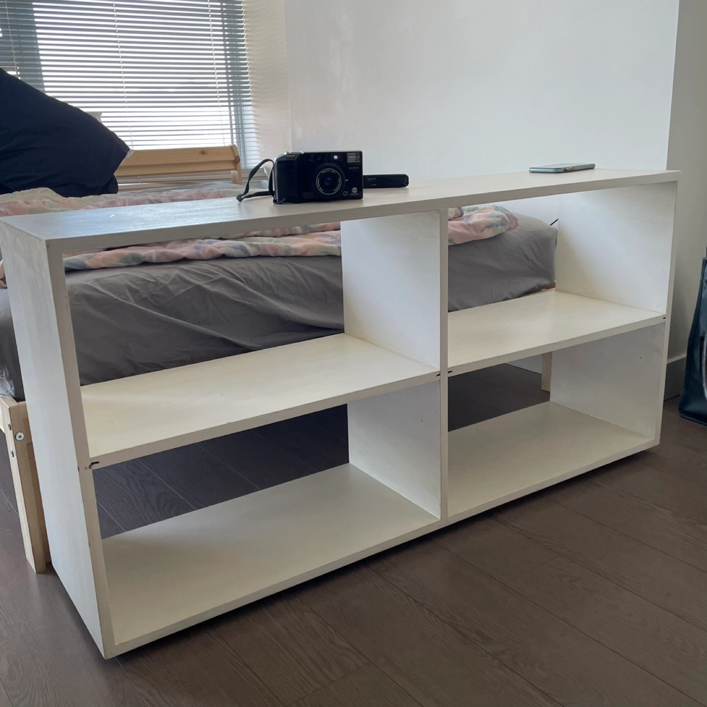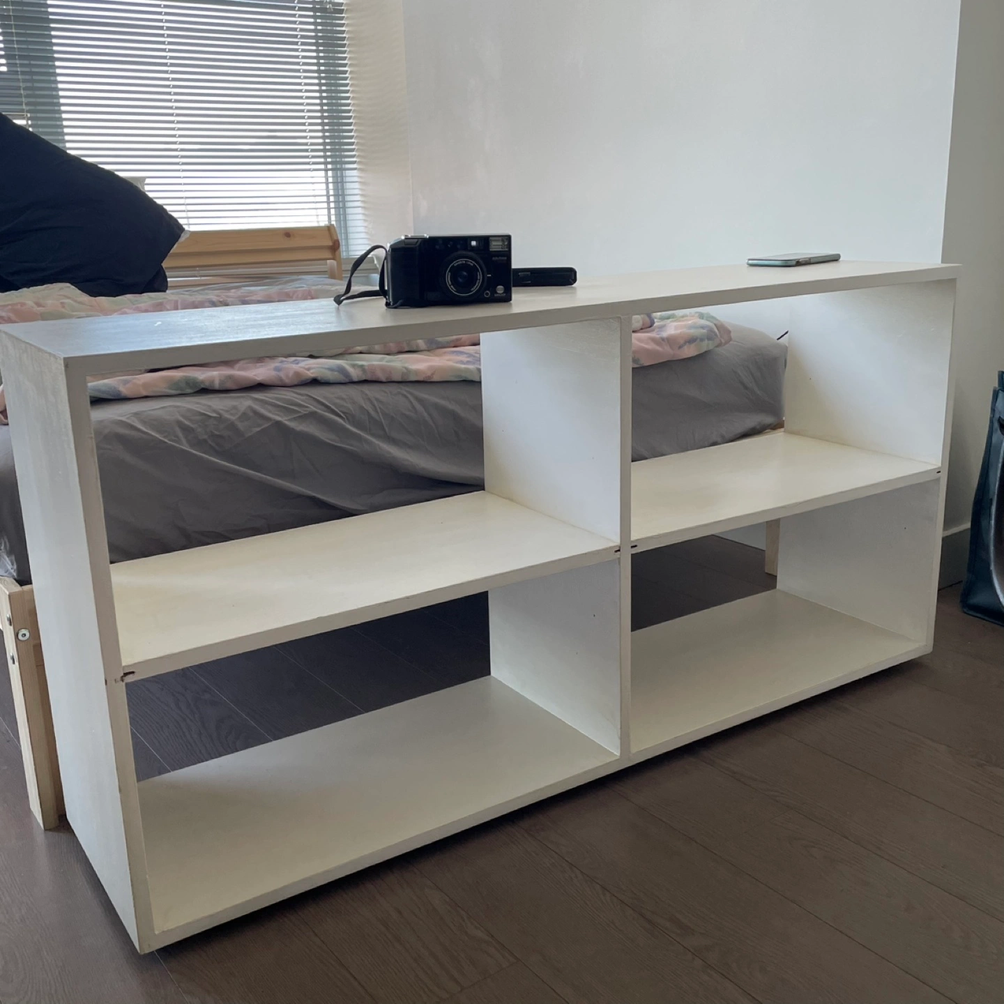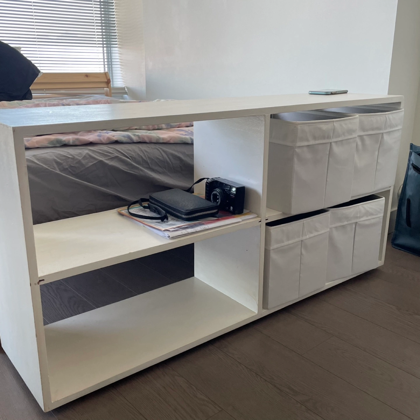 Selling a white storage shelf unit. It has a simple, clean design with open shelving on one side and space for storage bins on the other. Perfect for organizing books, toys, or other items in your home.