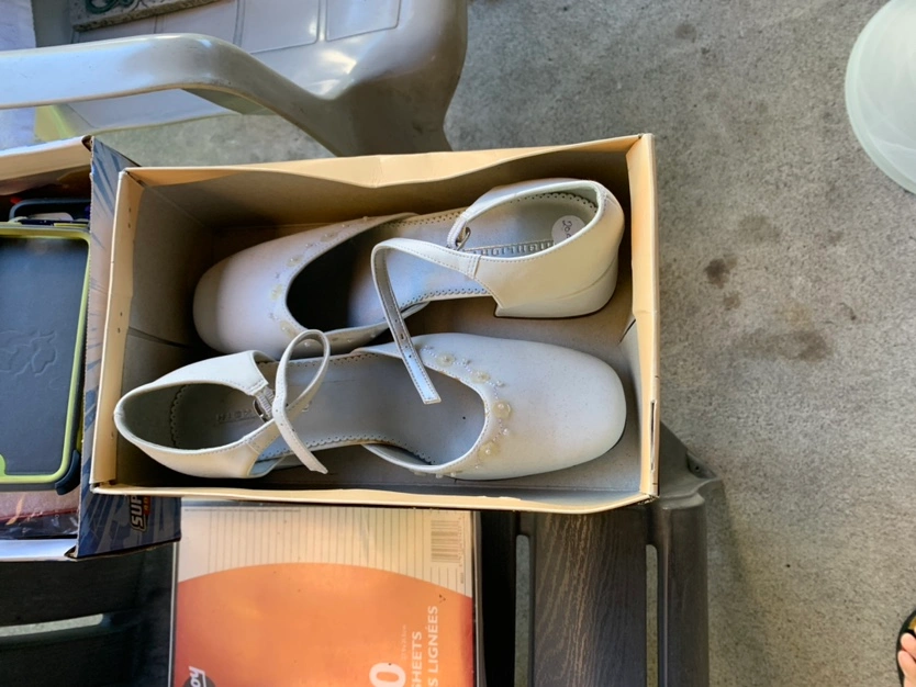 White heels with ankle strap. Embellished with white beading. Brand new. Never worn. Bought for a wedding but they ended up being too small by the time the wedding came.