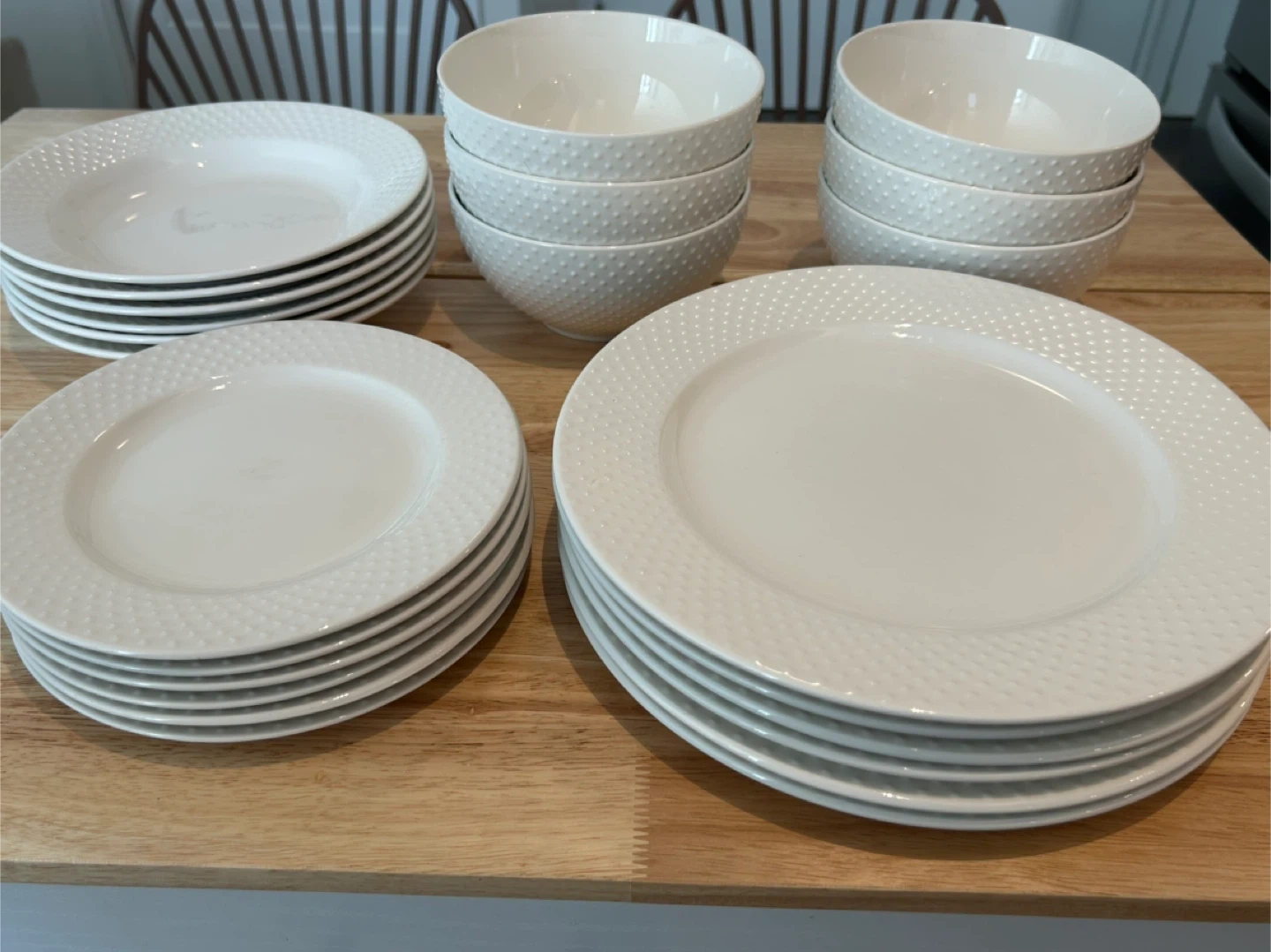 Selling a set of: . 24 ps white dinnerware (Canvas), including 6 large plates, 6 deep plates, 6 dessert plates and 6 bowls . 3 white ceramic bowls (from Portugal): large, medium and small All items are in great condition and ready for a new home.