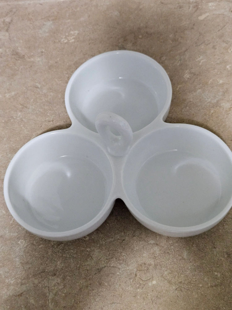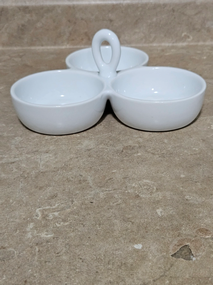Small, white, three-compartment serving dish. Perfect for condiments, dips, or small snacks. Features a convenient carrying handle.