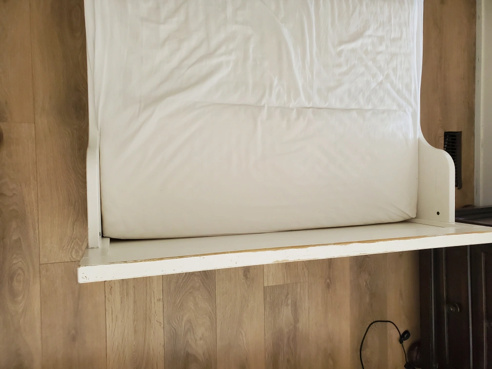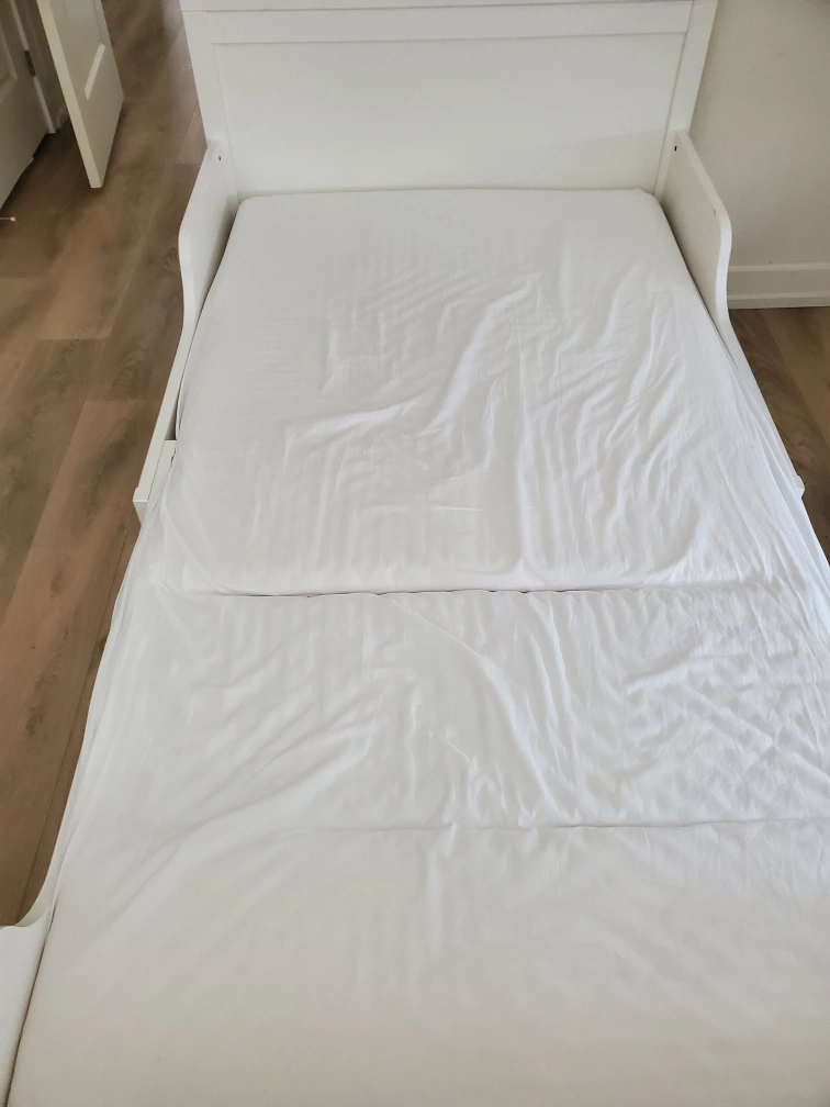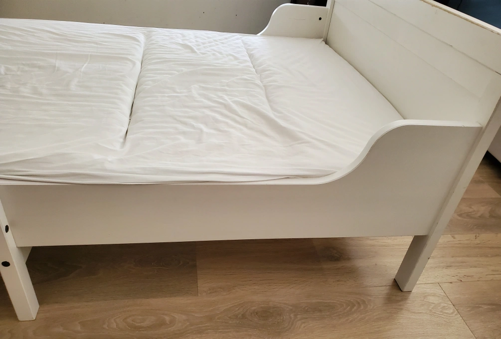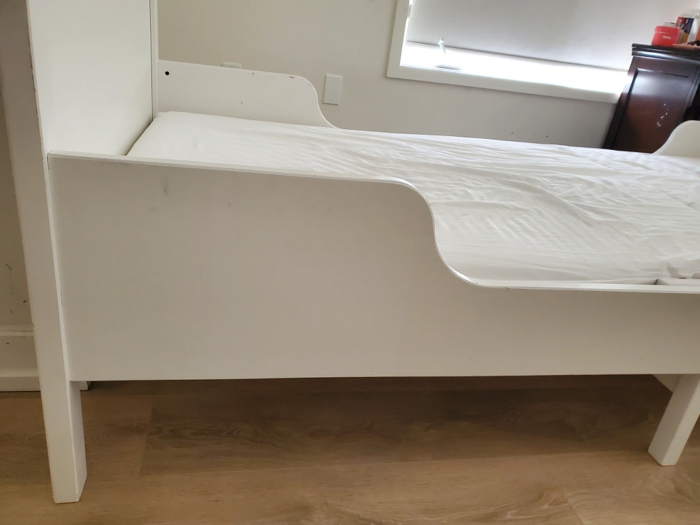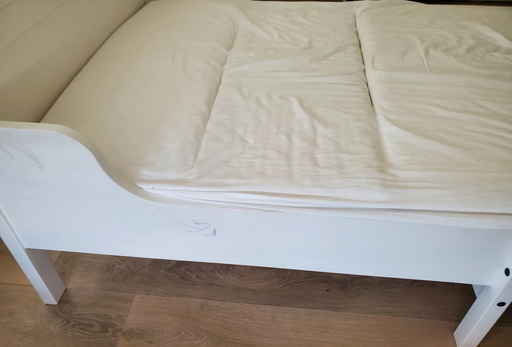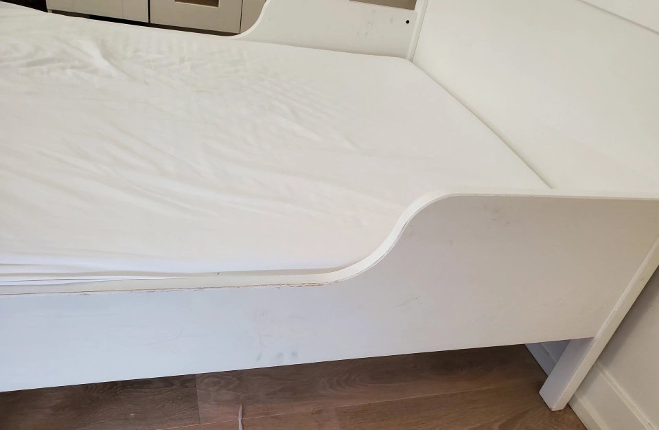 Selling a white toddler bed! It's in good condition and ready for a new home. There are some signs of use, such as scratches.