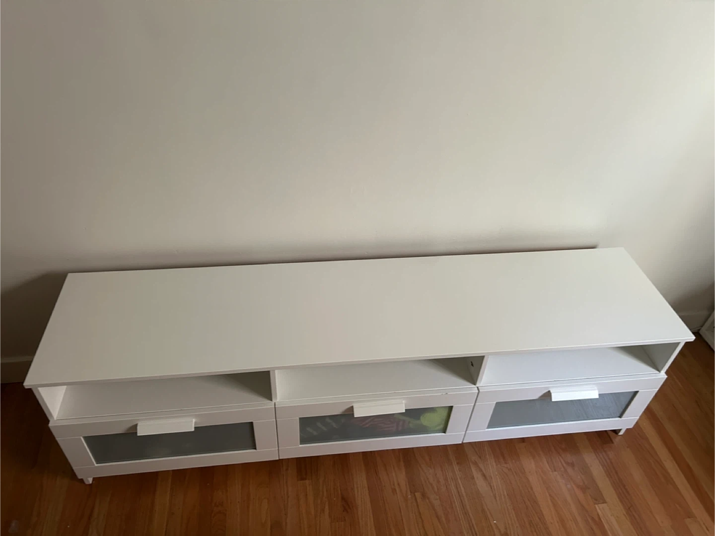 Selling a white TV stand/ storage unit, suitable even in the bedroom without a TV, as it has a lot of storage space. Very sturdy, only selling as moving back to Europe. Excellent condition, but has some minor wear and tear, as shown in the photos, but barely noticeable once you have your stuff on there.