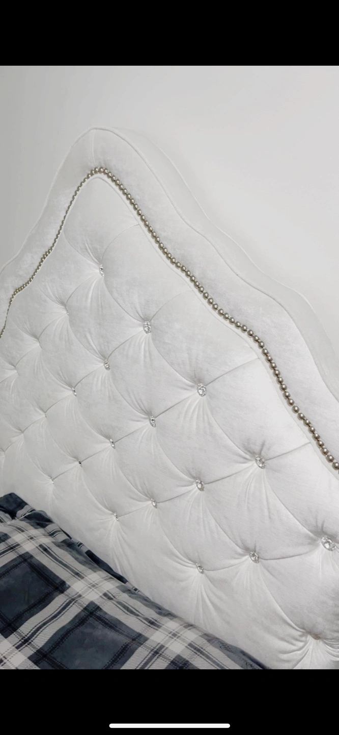 Elegant white bed frame. Features a tufted headboard with crystal accents. Single bed size. Good condition. Comes with like new mattress. Original price bought $2800. Imported from Italy. Have 2 in stock.