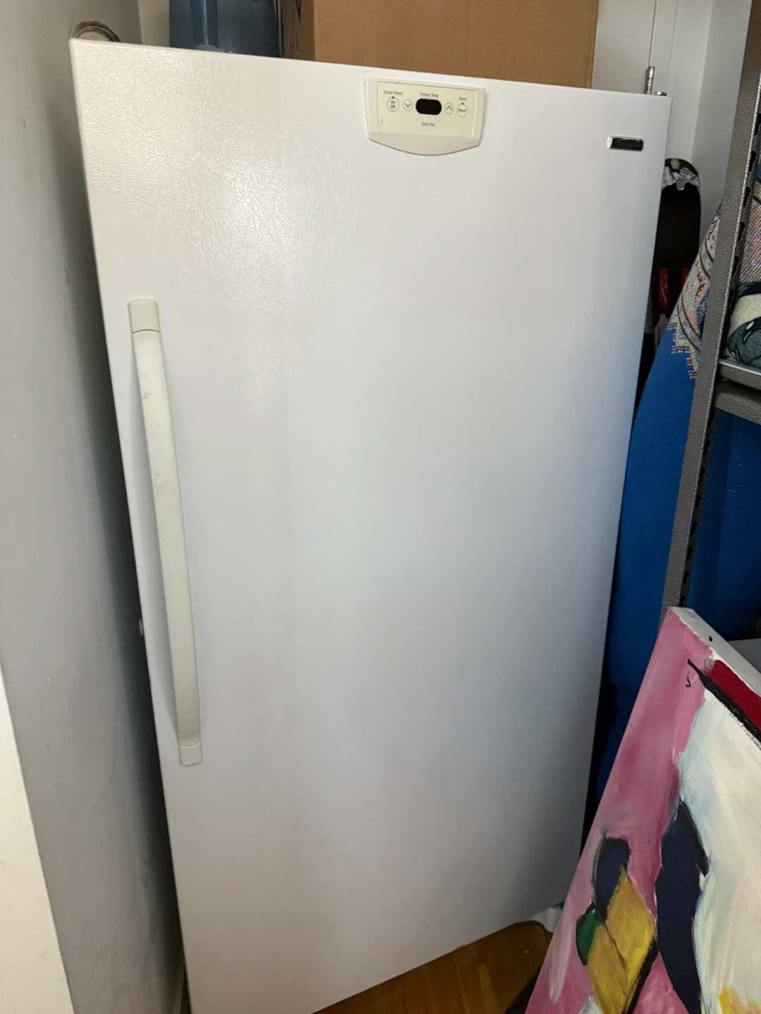 Selling a white upright freezer. It's in good condition and ready to keep your food frozen. Perfect for extra storage!