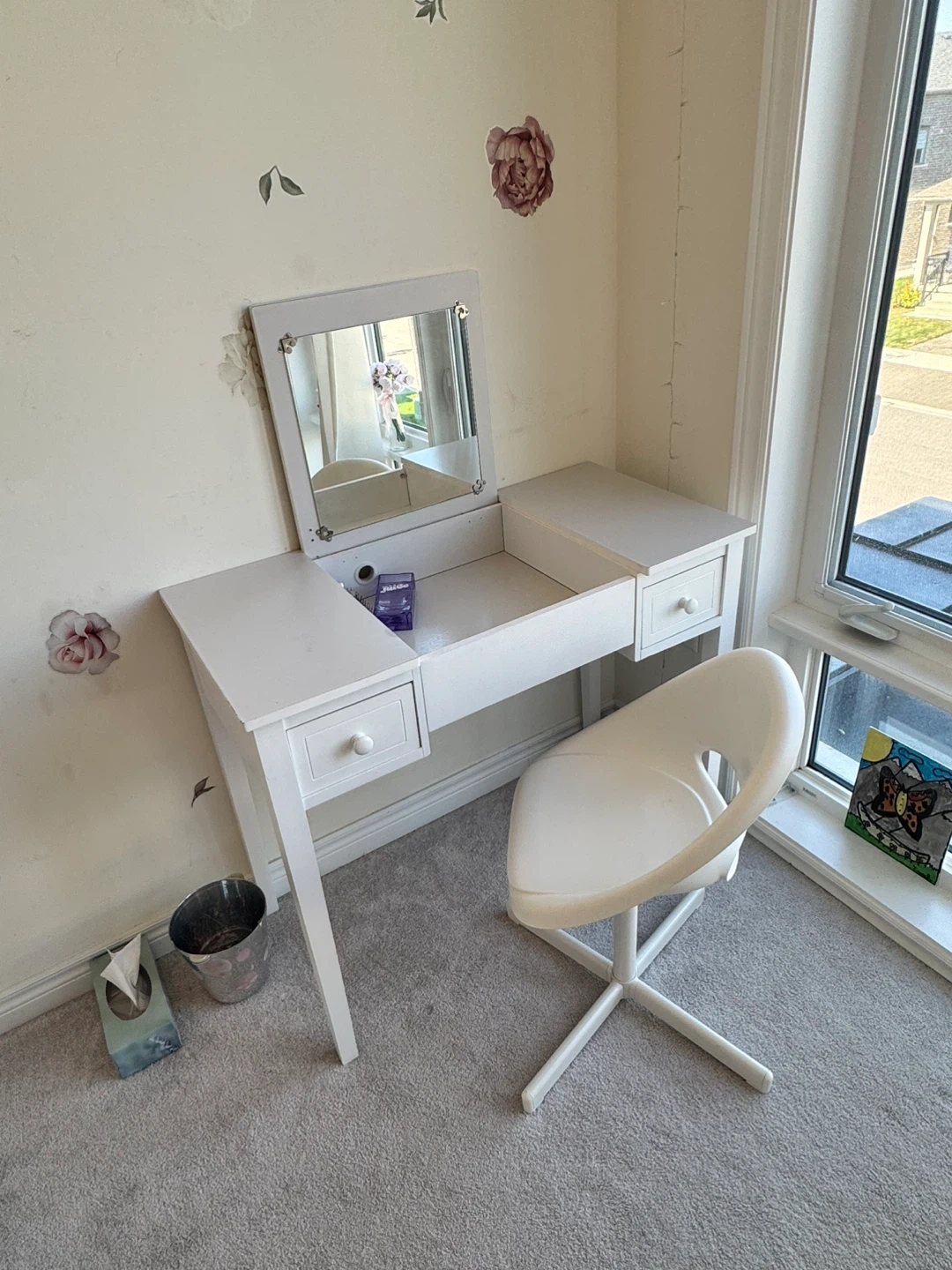 Selling a cute white vanity desk with a flip-up mirror! Perfect for a bedroom or dressing area. It has two drawers for storing makeup and accessories. The mirror is in great shape, and the desk is sturdy and clean. A few scratches on top. IKEA chair included