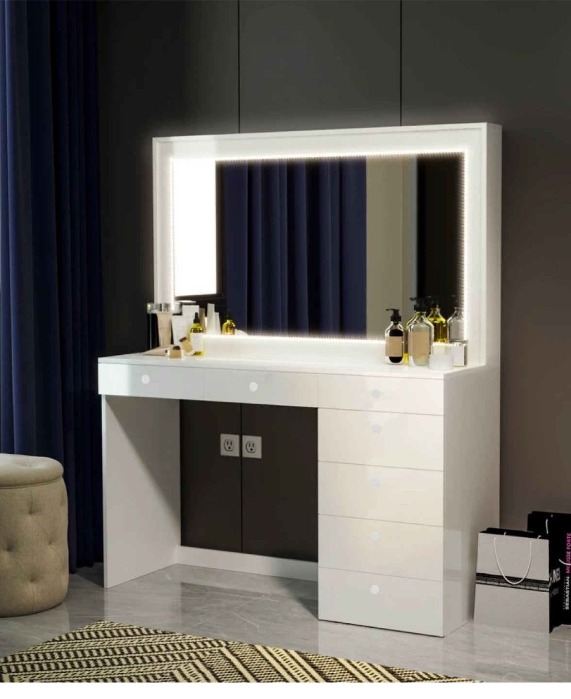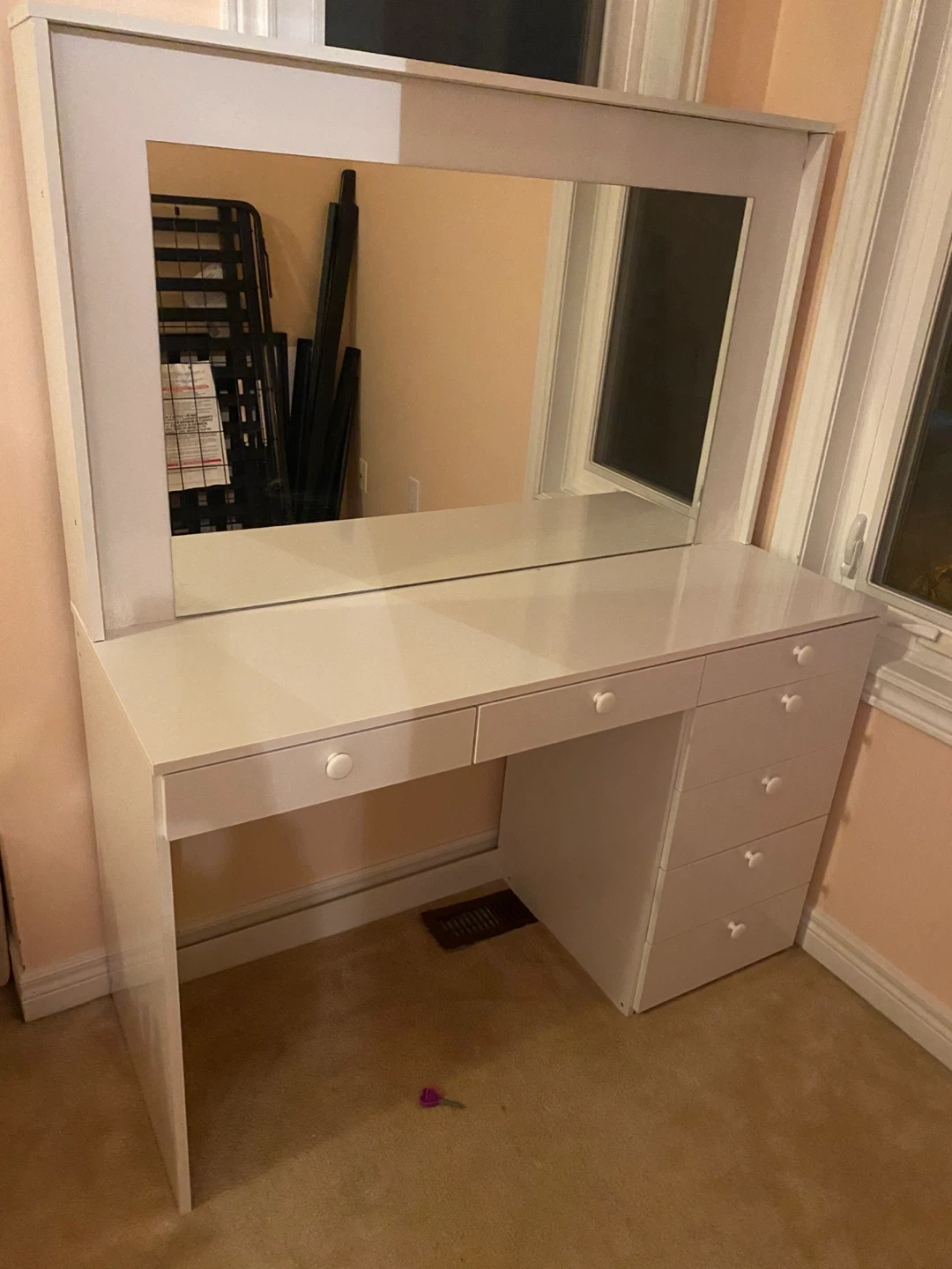 Selling a white vanity makeup table with a mirror! It features a sleek design with drawers for storage. Dimensions are approximately 47.2" wide, 58.2" high, and 17.7" deep, making it a great fit for any bedroom or dressing area