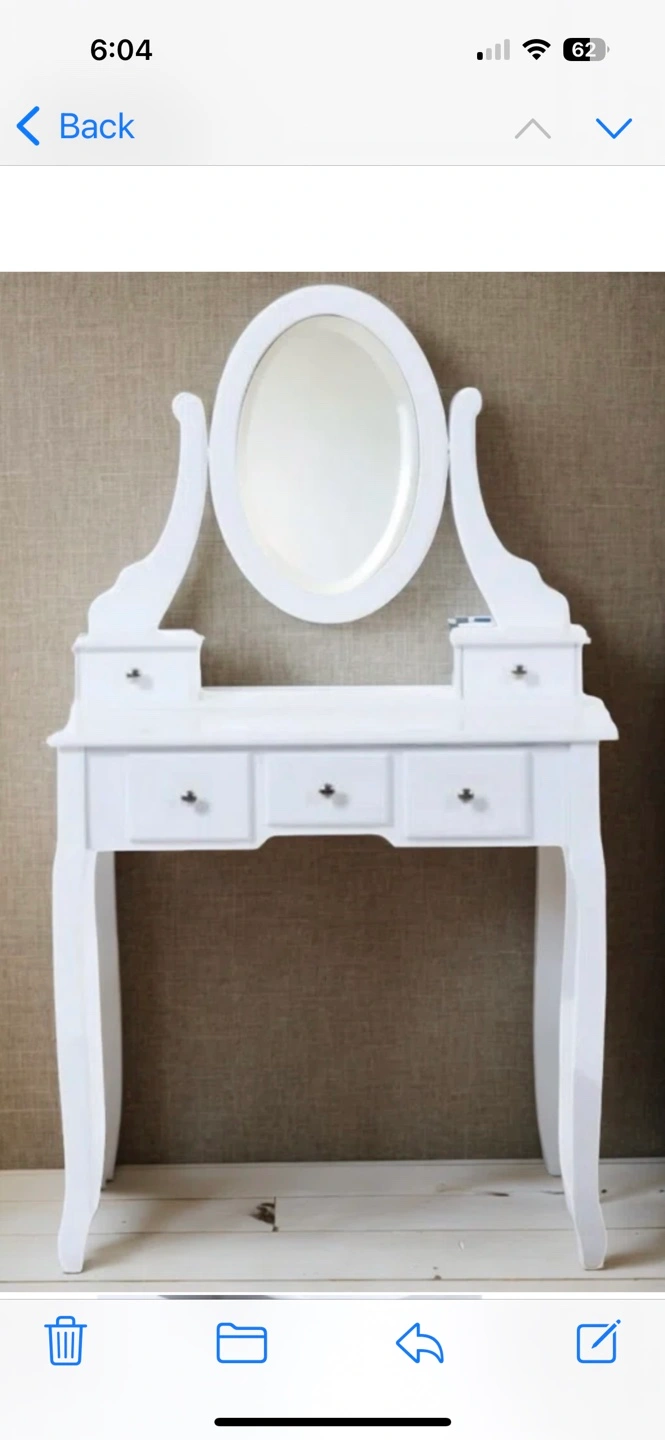 Elegant white vanity table. Features a large oval mirror with storage. Multiple drawers, both large and small. Perfect for makeup and jewellery. Mirror: 15.4” x 20.2”; 360deg rotation Desk: 31.5” x 15.8” Vanity table with mirror: 55” tall