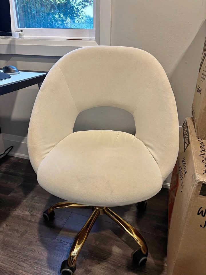 Moving across the country & it can’t come with me! Small stain on front of the seat but will shampoo & steam clean before sellling. Beautiful off white velvet & gold accent chair. Pick up from Kingston/Warden