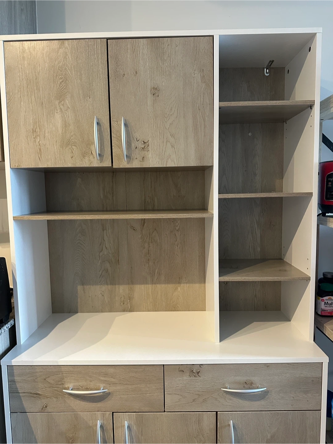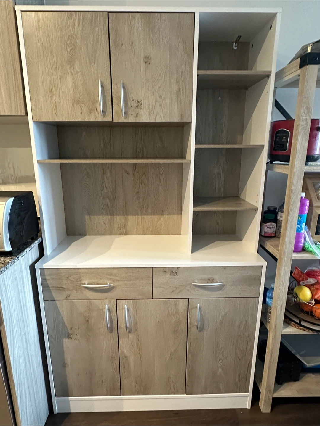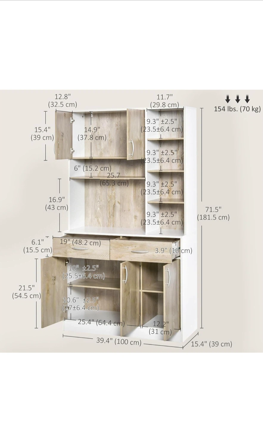 Selling a hutch cabinet with a white and wood grain finish! It features a combination of cabinets, drawers, and open shelving for versatile storage. The dimensions are approximately 71.5" (height) x 39.4" (width) x 15.4" (depth). Perfect for adding storage and style to your dining or living area
