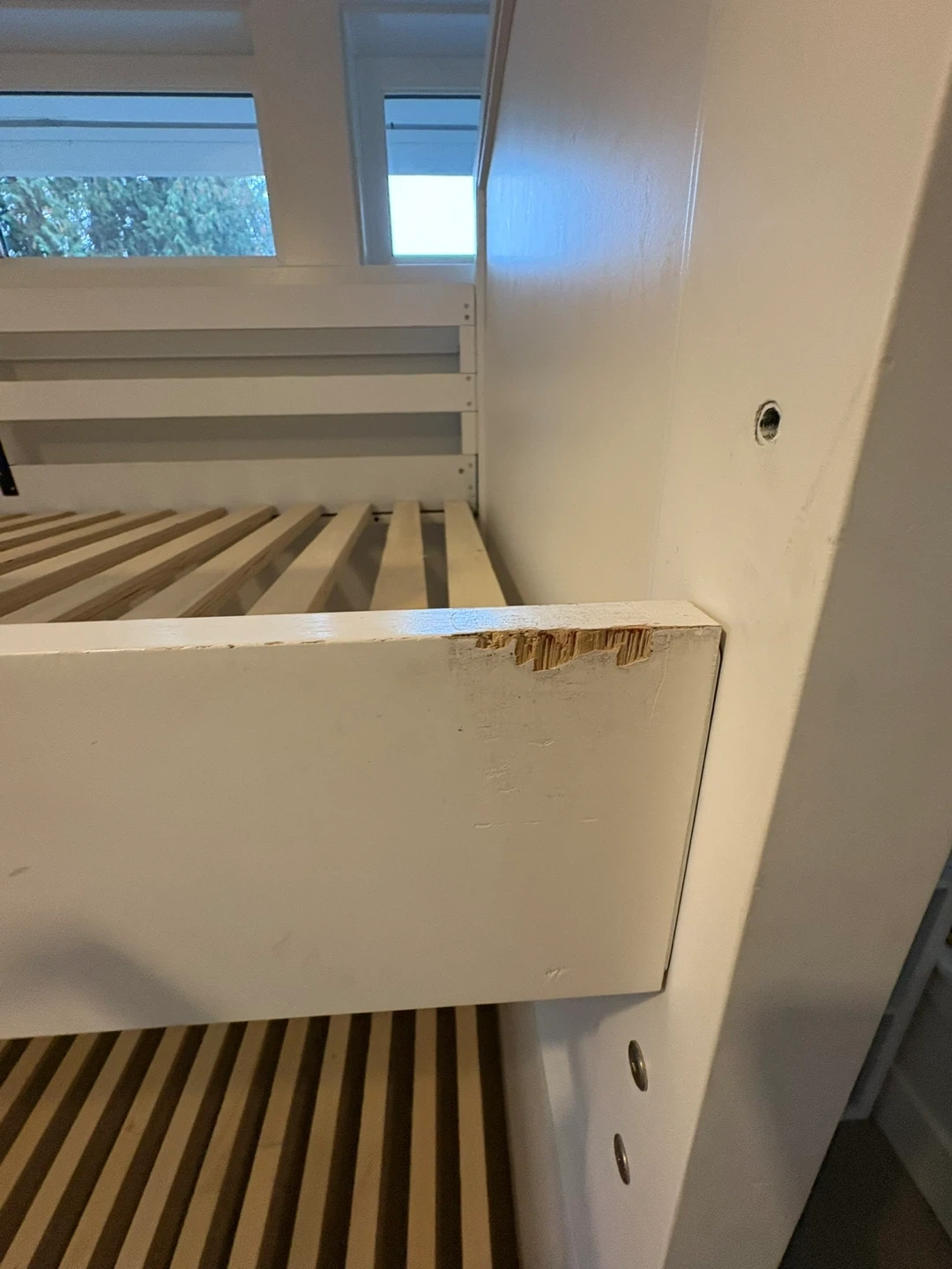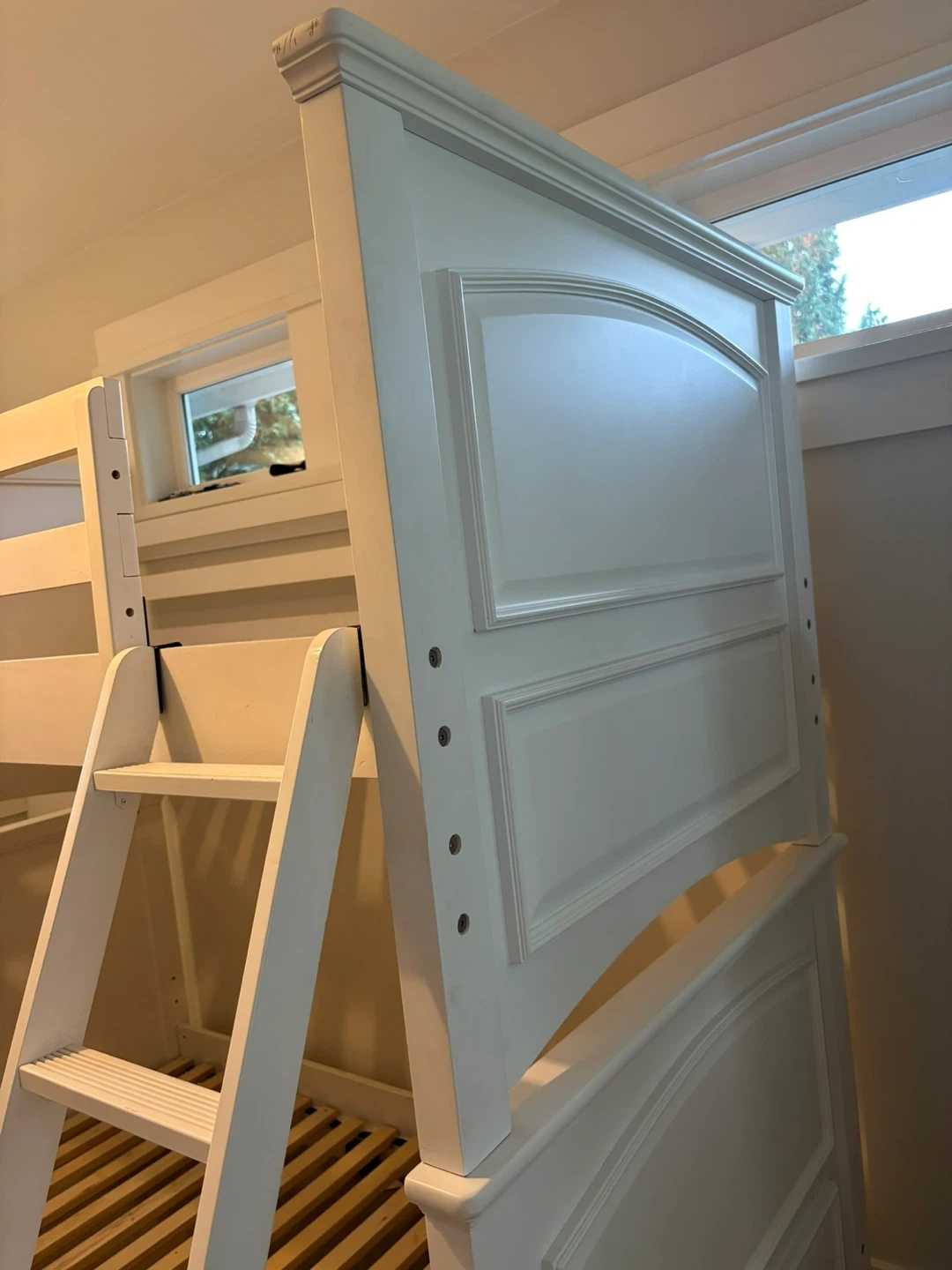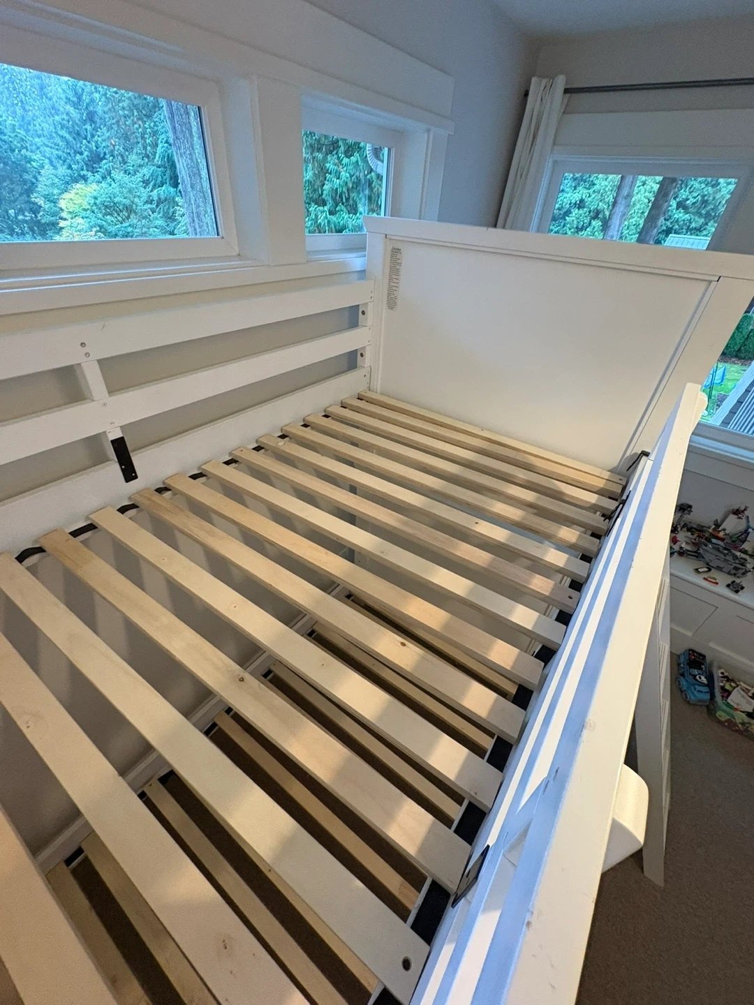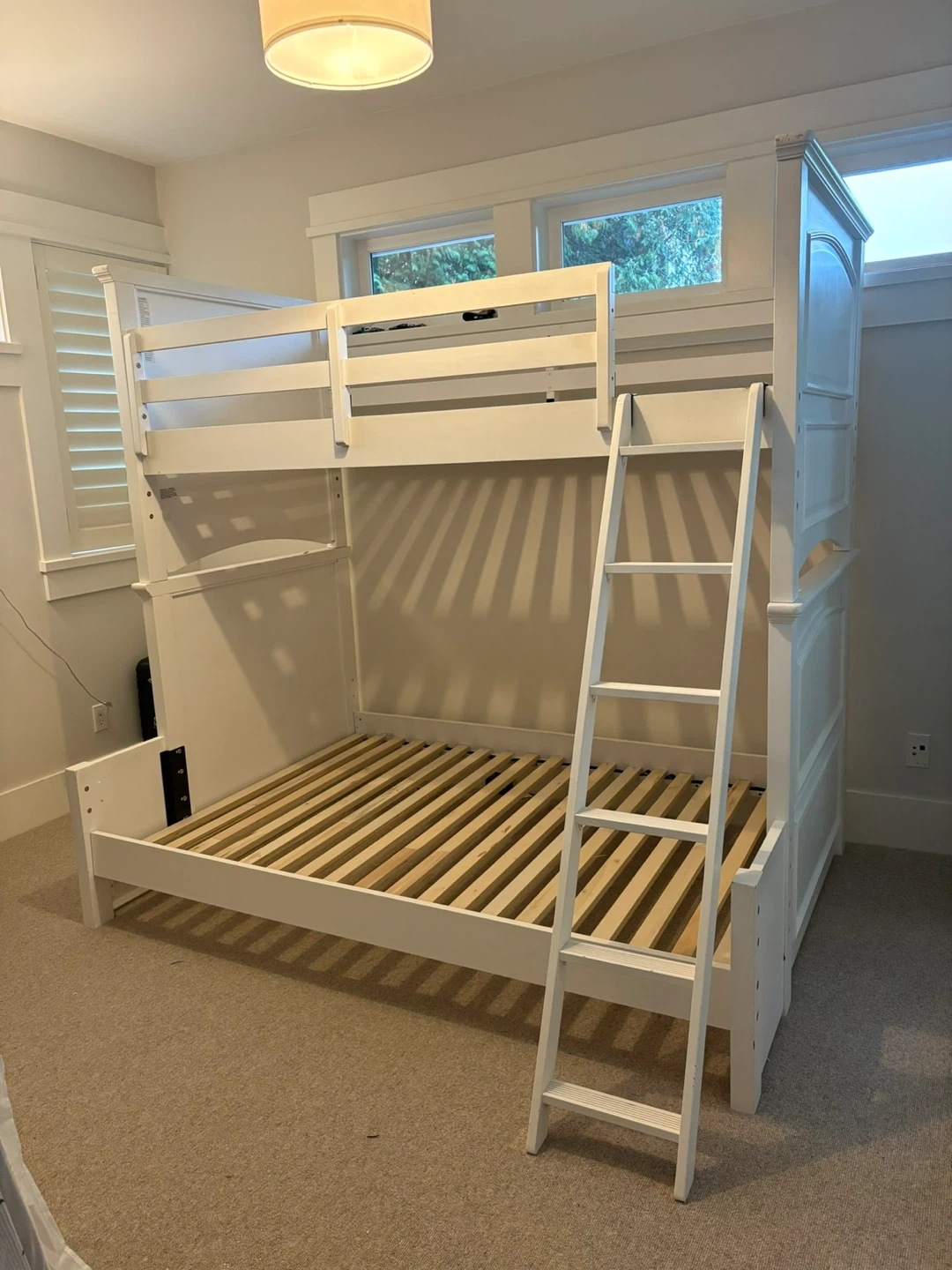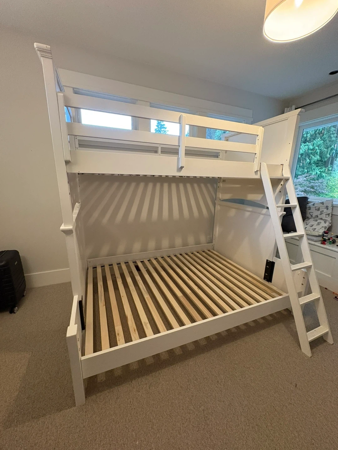 Legacy Classic Kids Twin Over Full Bunk (can also reconfigure as 2 Twin size beds). Great quality bunkbed, we used it as a twin over double but it also adjusts to a twin over twin (comes with slats: 1 twin, 1 double slats) Price reflects som minor wear where the ladder was (see last photo). Width 69" (175.3 cm) Depth 82" (208.3 cm) Height 78" (198.1 cm) Has been disassembled and ready for pick up! Prompt pick up Lynn Valley