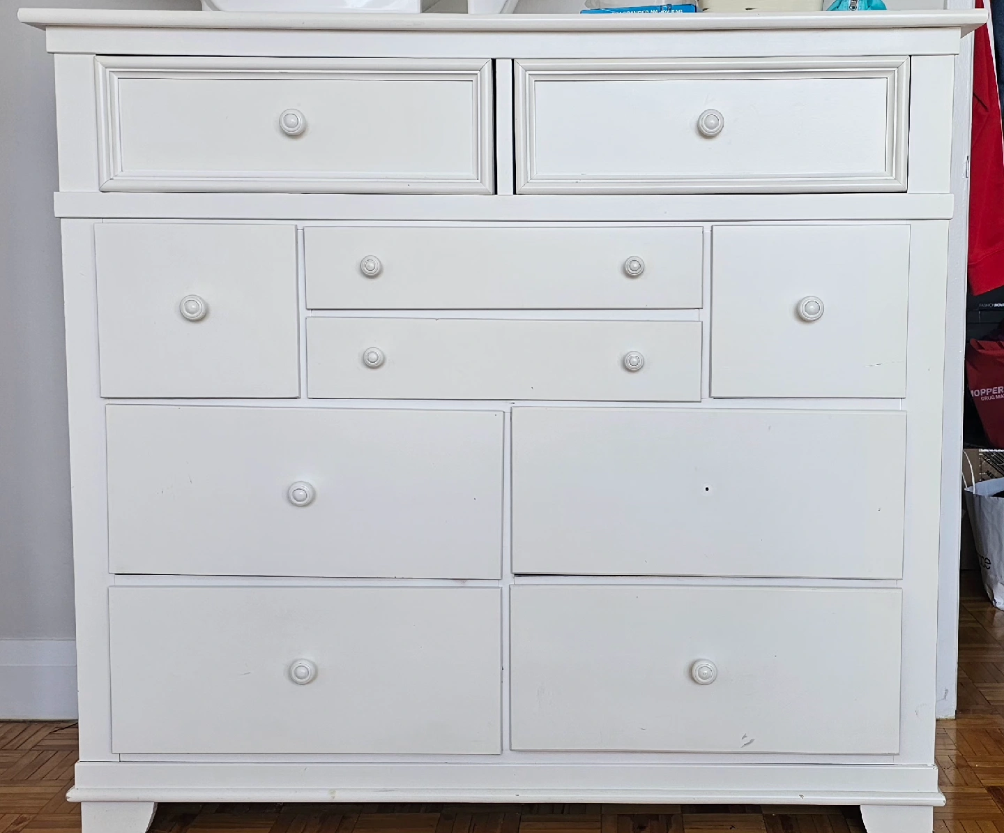 Here's a white wooden dresser with multiple drawers. It has a classic design and would be perfect for a bedroom or nursery. There's a small hole (handle inside drawer just needs a nail to fix it back) in one of the drawers and some wear and tear, but it's still in good condition and very functional