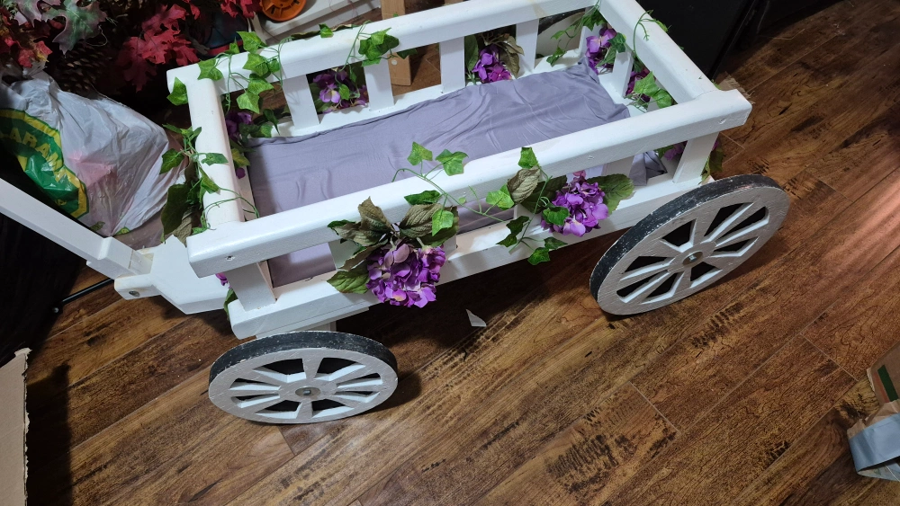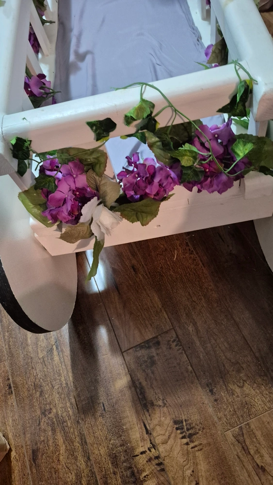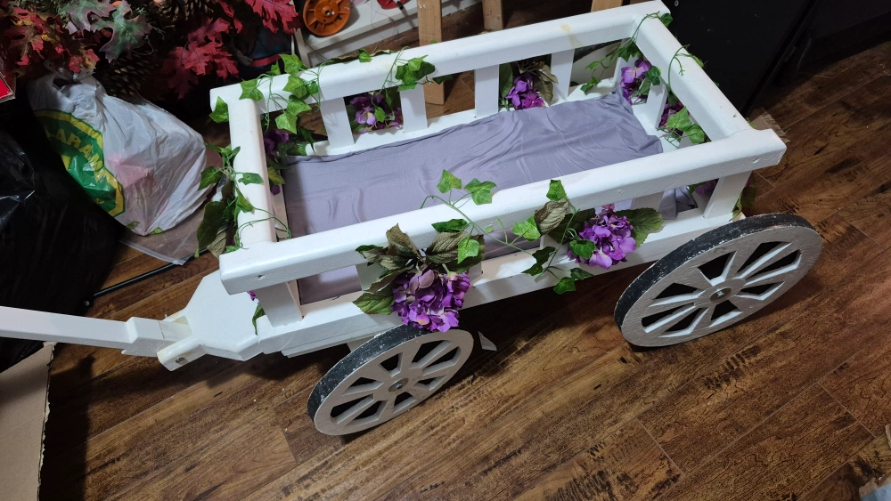 Adorable white wooden wagon, perfect for photoshoots. Features purple flowers and greenery accents. Includes a fabric insert. Along with guest name board.
