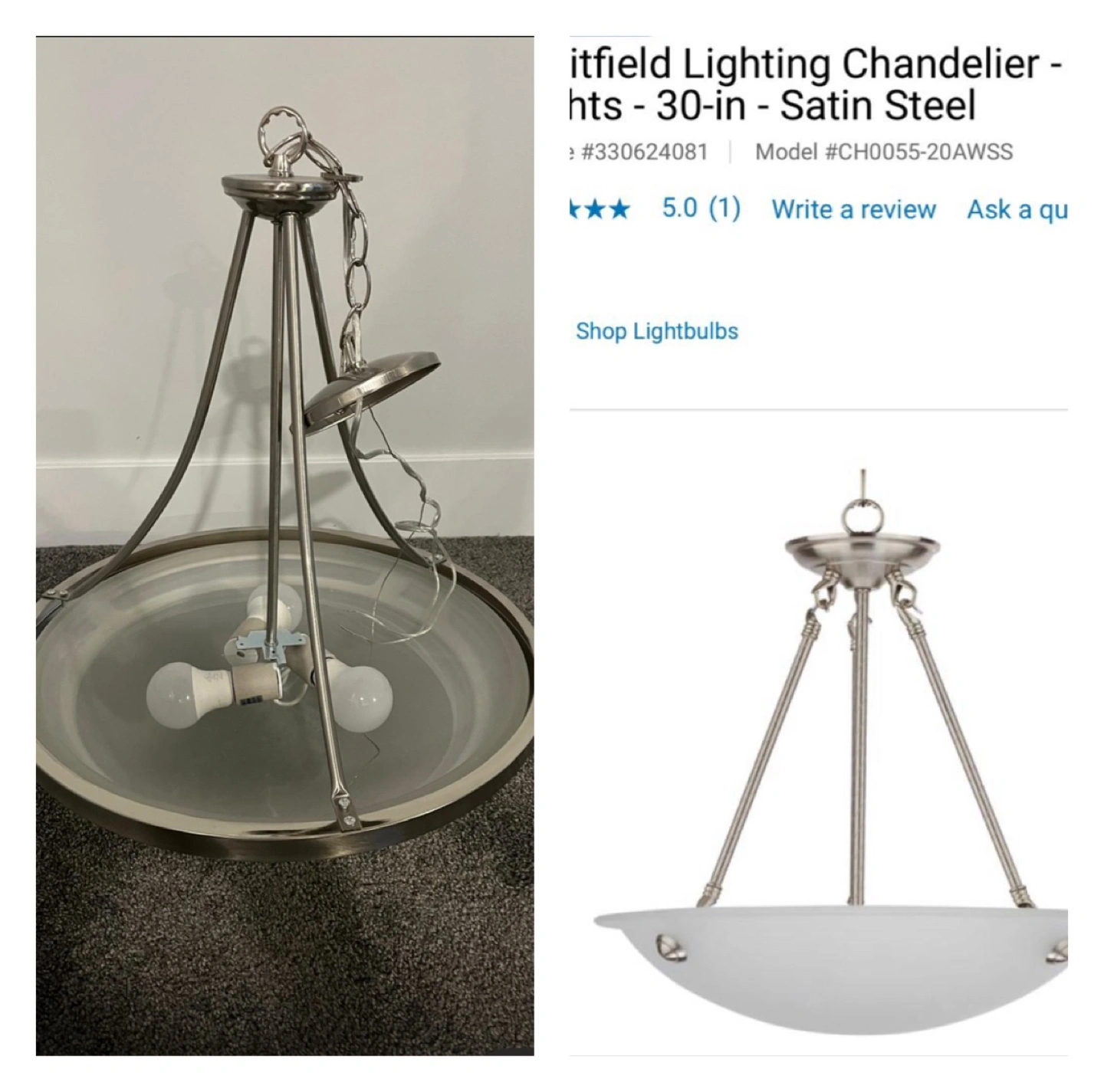 Elegant chandelier. Features a satin steel finish. Includes a chain for hanging. The light fixture is suitable for any room, especially to install above a dining table, and offers a calm ambience. Qty- 2