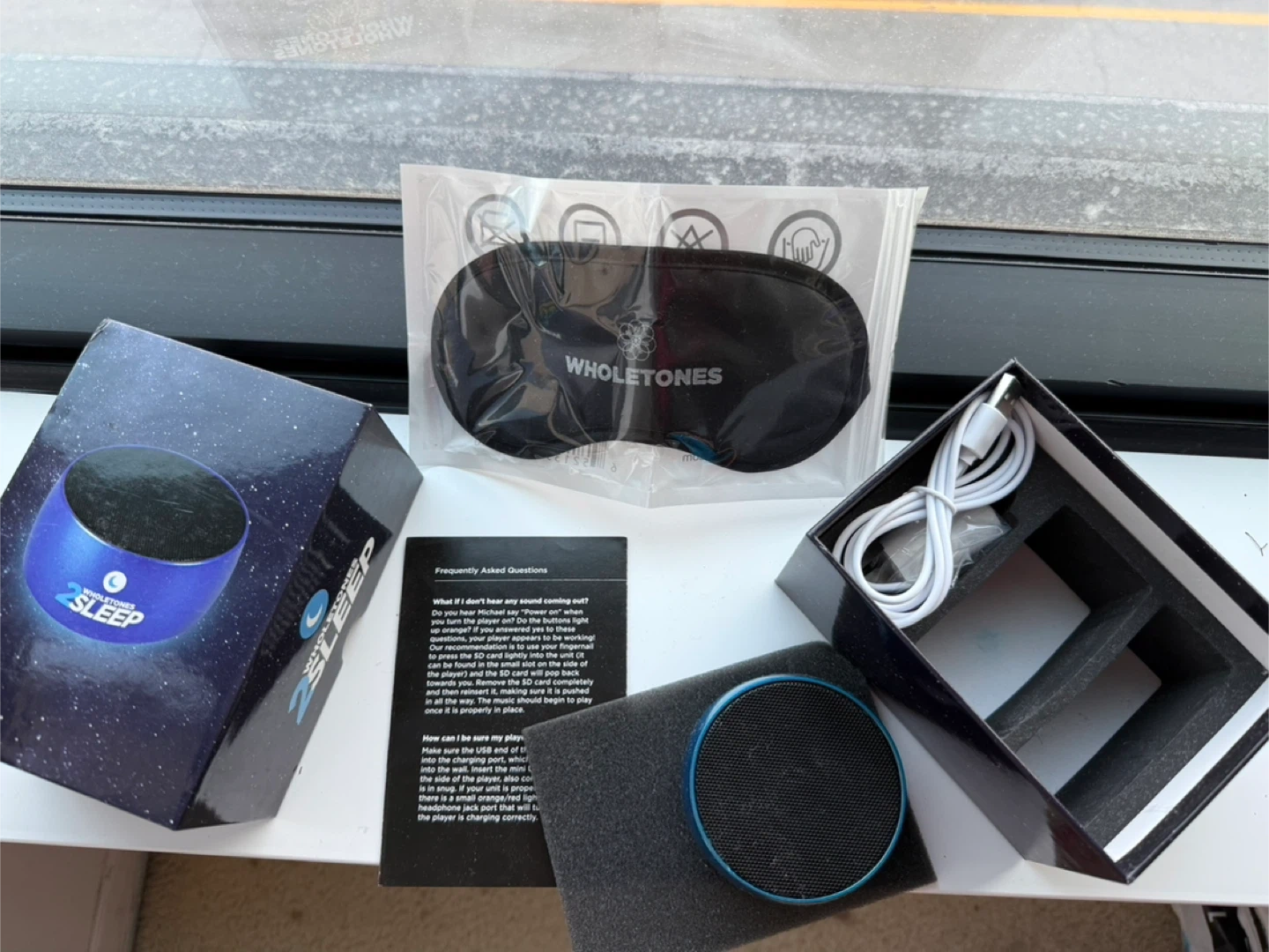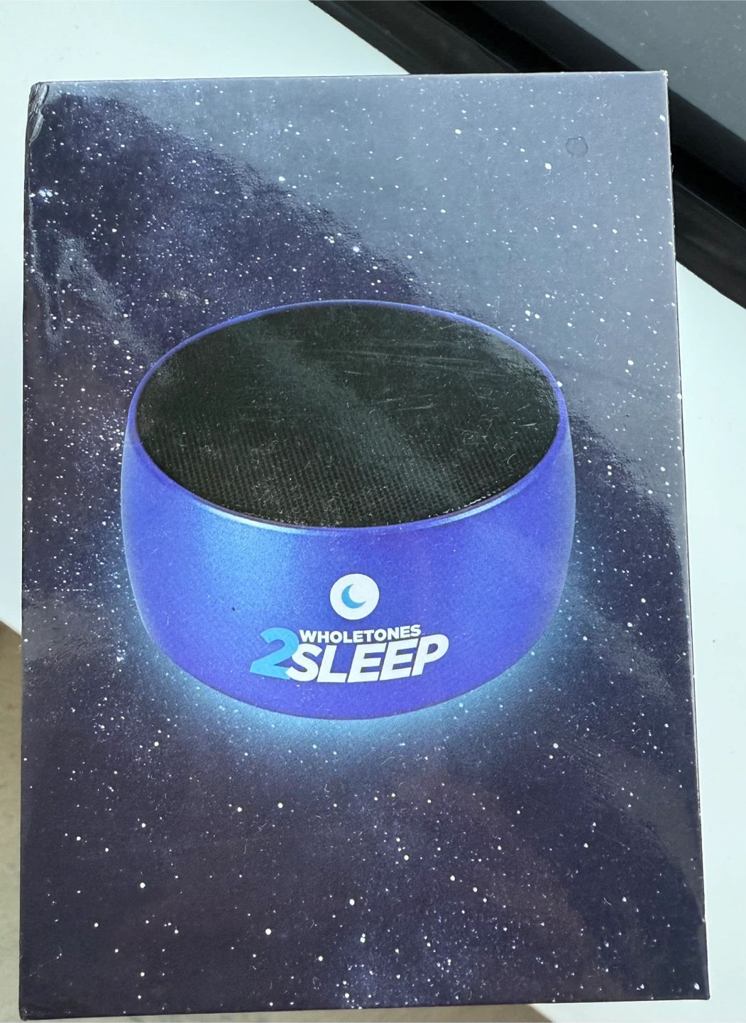 Selling a brand new Wholetones 2Sleep sound machine! It's designed to help you relax and fall asleep more easily. The box is included, along with the eye mask and charging cable.
