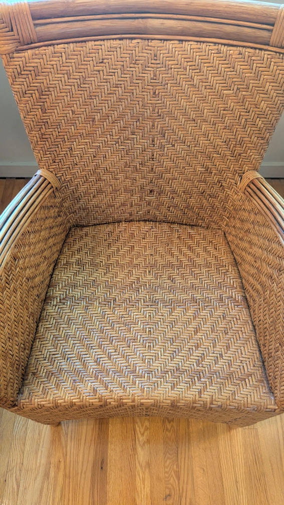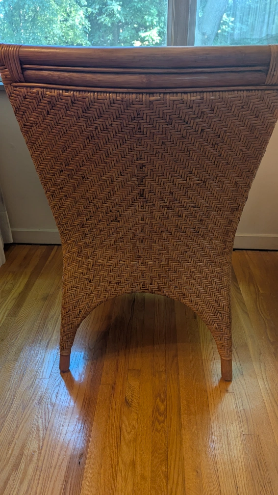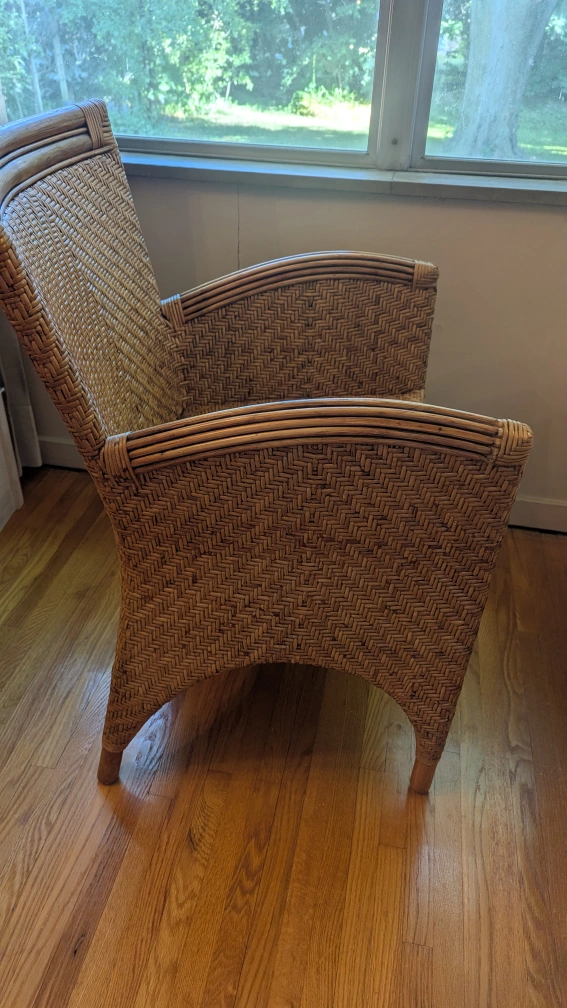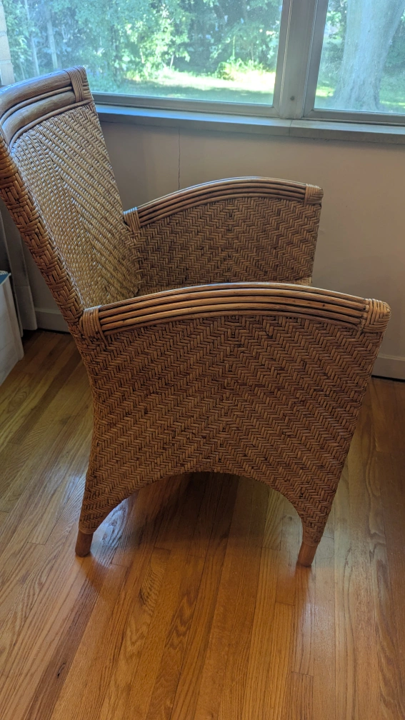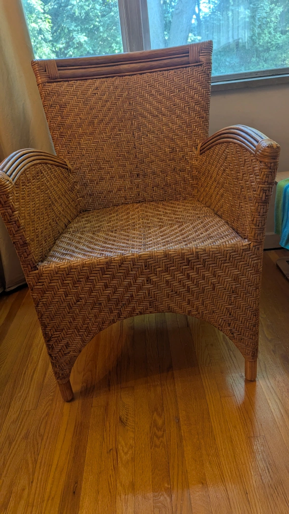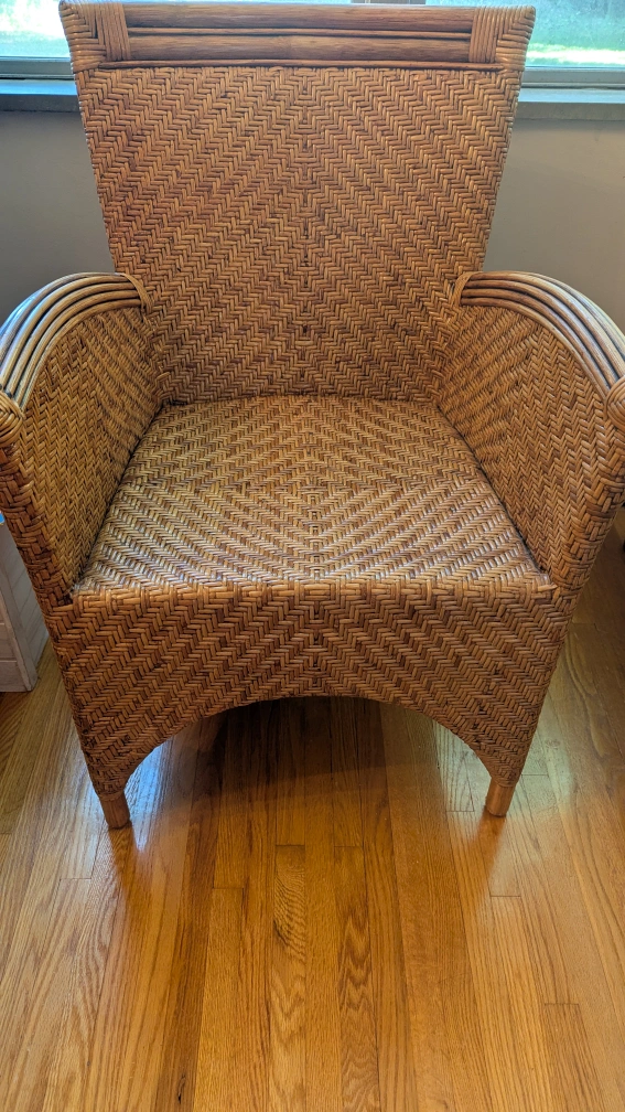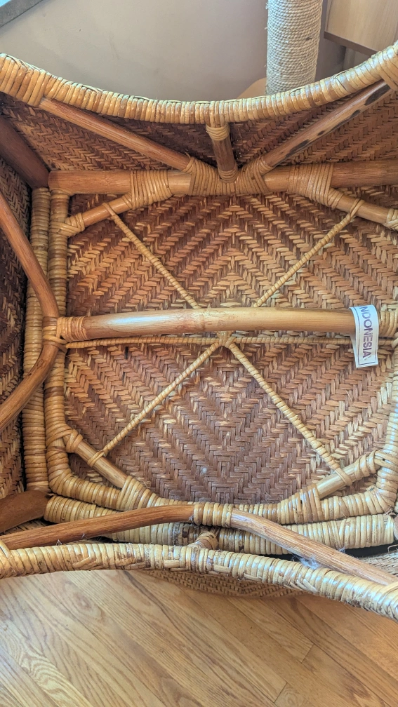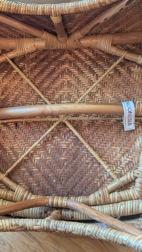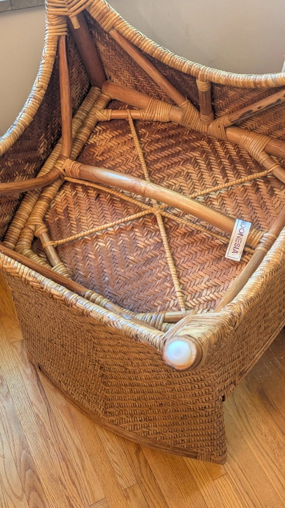 This wicker armchair has a lovely natural woven design. It's a unique piece that would look great in any sunroom or living space. The chair is sturdy and comfortable, perfect for relaxing with a book or enjoying a cup of tea. The tag says it's from Indonesia