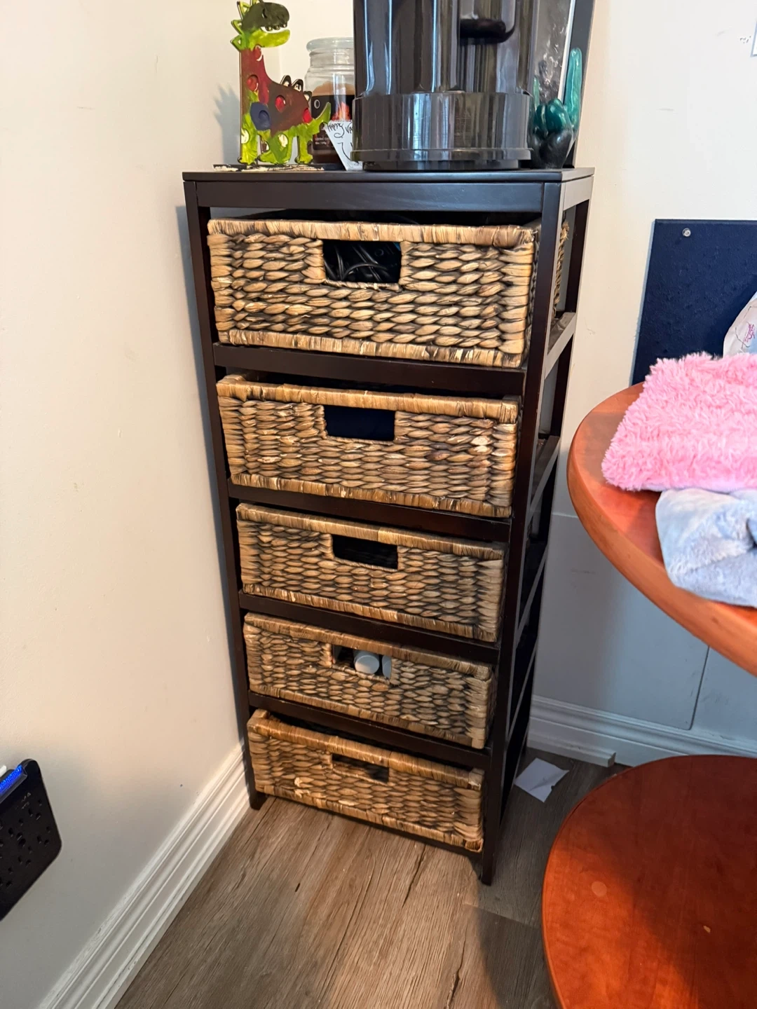 This is a wicker basket storage tower with a dark brown frame. It has four drawers to help keep your space organized. It's in great condition and ready for a new home!