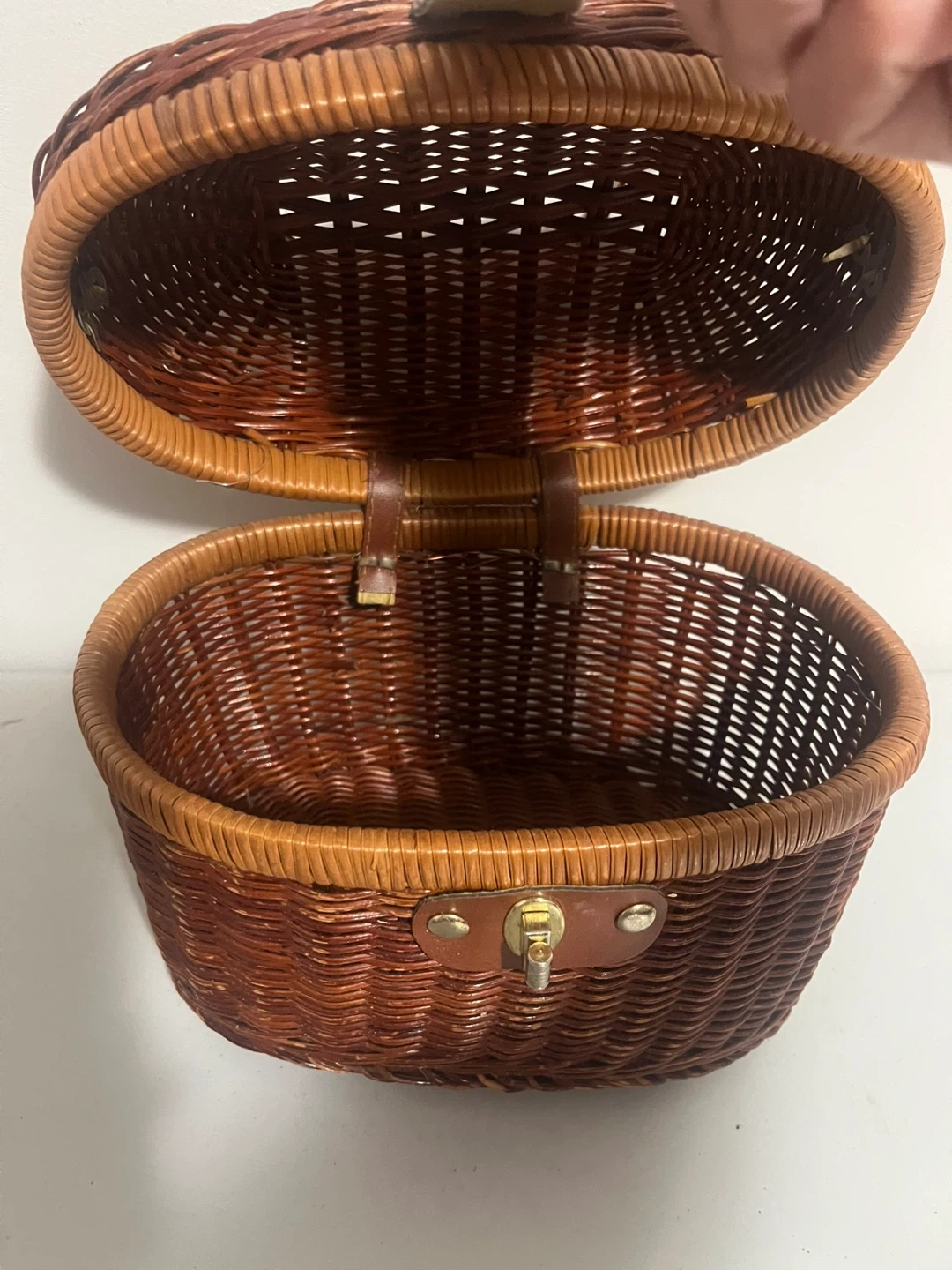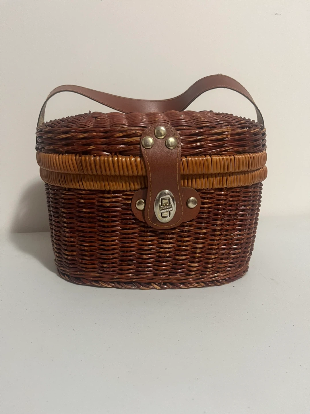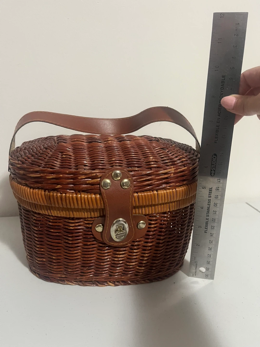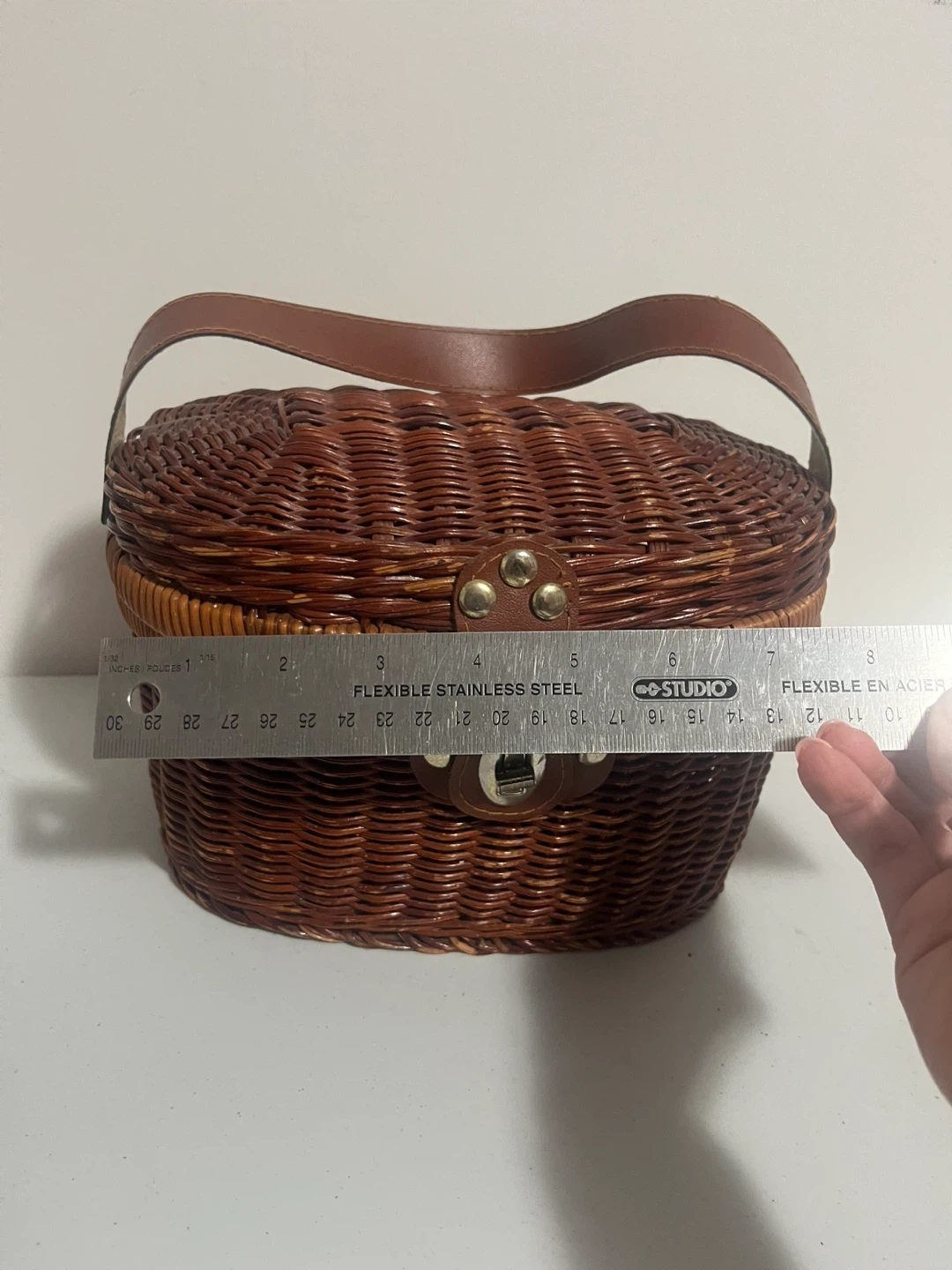 Selling a cute wicker basket with a leather handle! It's in great condition and perfect for picnics or storage. The basket is brown and has a secure latch. It measures approximately 12 inches in height.