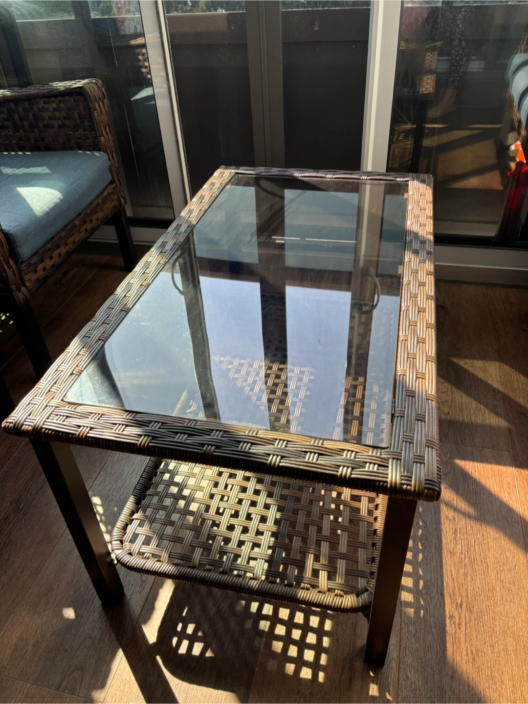 Selling a wicker coffee table with a glass top. It's in good condition and would look great in a living room or on a patio. It has a shelf underneath for storage.
