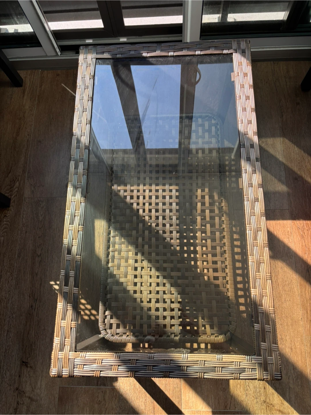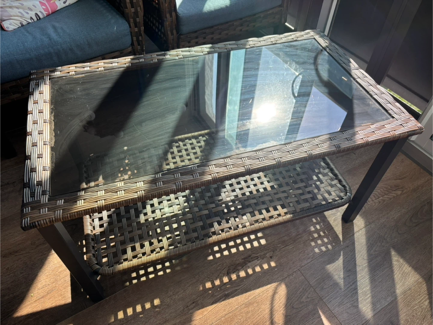 Selling a wicker coffee table with a glass top. It's in good condition and would look great in a living room or on a patio. It has a shelf underneath for storage.