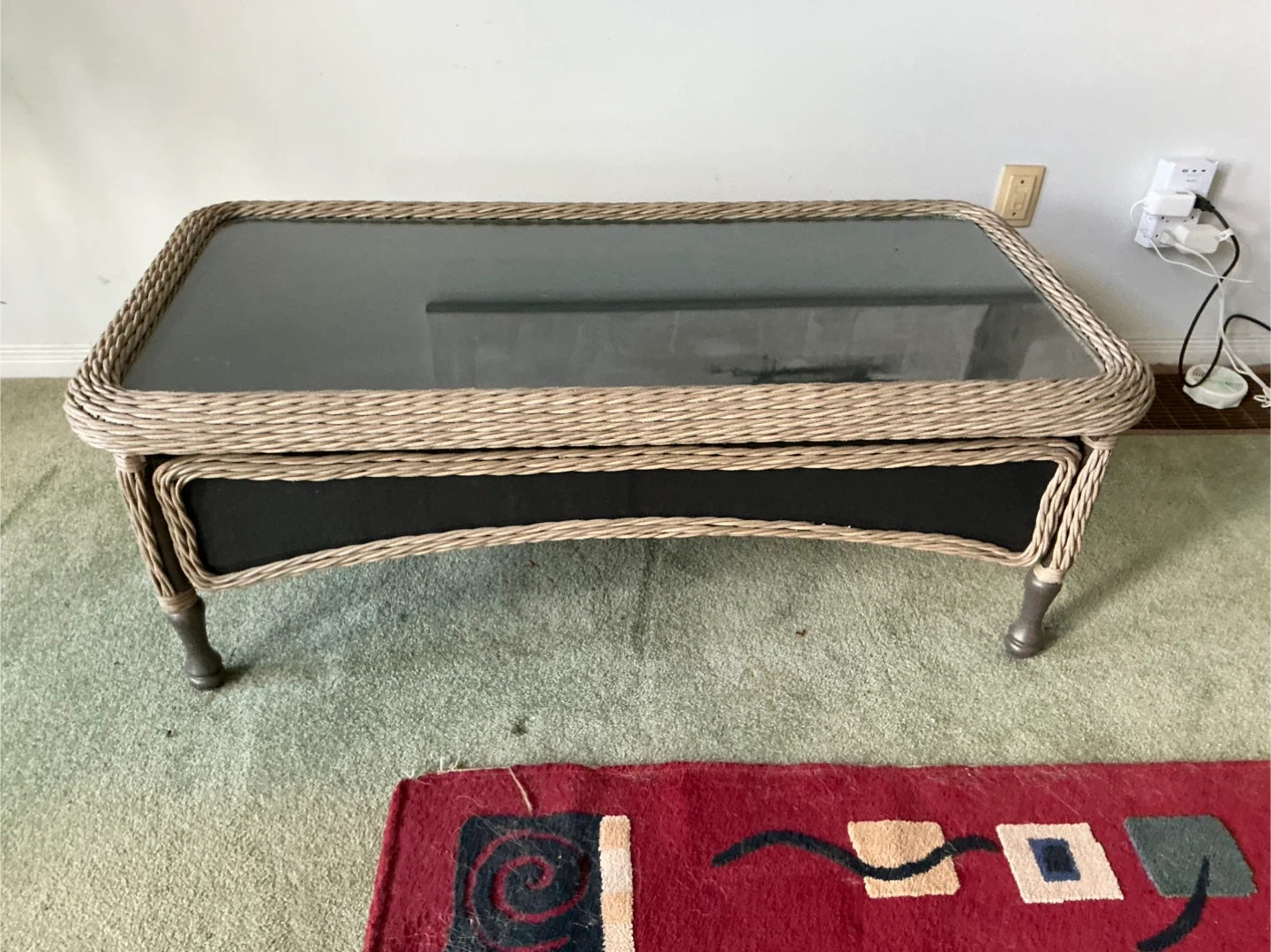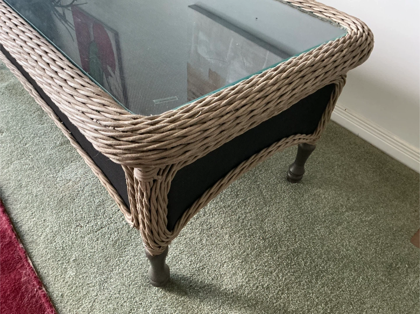 Selling a lovely wicker coffee table with a glass top! It's in great shape and would look fantastic in any living room or sunroom. The wicker detailing adds a touch of natural charm, and the glass top is easy to clean. The legs are sturdy and stylish too!