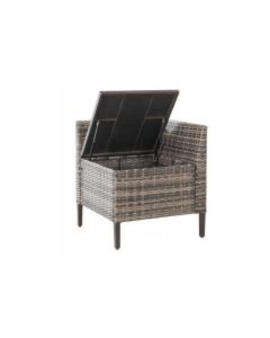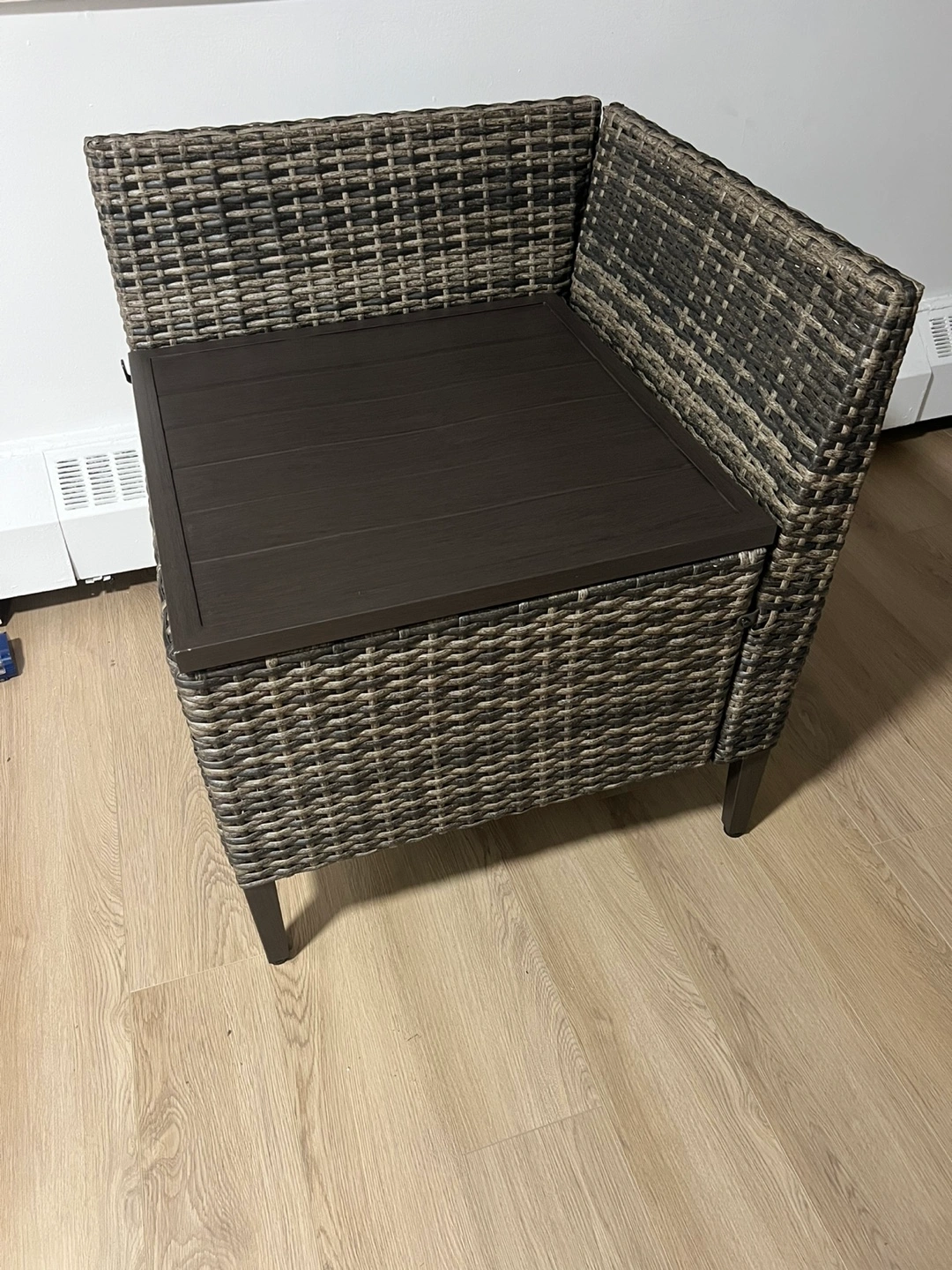This wicker outdoor storage chair is perfect for your patio or deck. It's in great condition and ready to use. The chair features a storage compartment under the seat, providing a convenient place to store cushions, pillows, or other outdoor essentials. It's a stylish and functional addition to any outdoor space